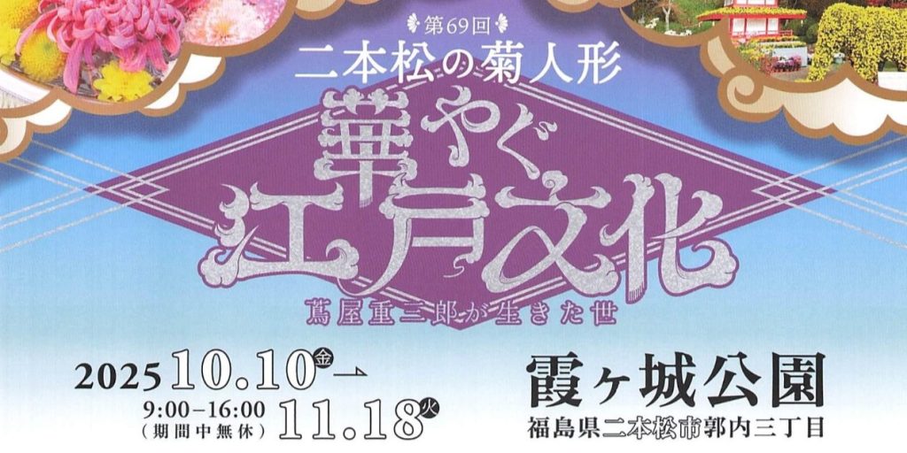 日本三大菊人形のひとつとして知られる秋の風物詩。今回は「華やぐ江戸文化」をテーマに、葛飾北斎や歌舞伎など江戸の華やぎを再現。約1万鉢の菊が彩る園内で、伝統と美の競演を楽しめます。 【会場】霞ヶ城公園(福島県二本松市郭内三丁目) 【日時】2025... -