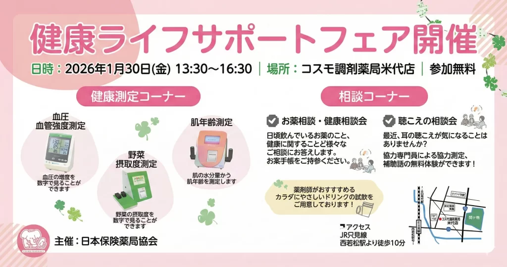 2026年1月30日(金)にコスモ調剤薬局 米代店で開催される健康ライフサポートフェア。血圧・血管強度・肌年齢・野菜摂取度の測定や、薬剤師・健康相談、聴こえの相談、補聴器の無料体験ができます。薬剤師おすすめのドリンク試飲も用意。参加費無料。福島県... -
