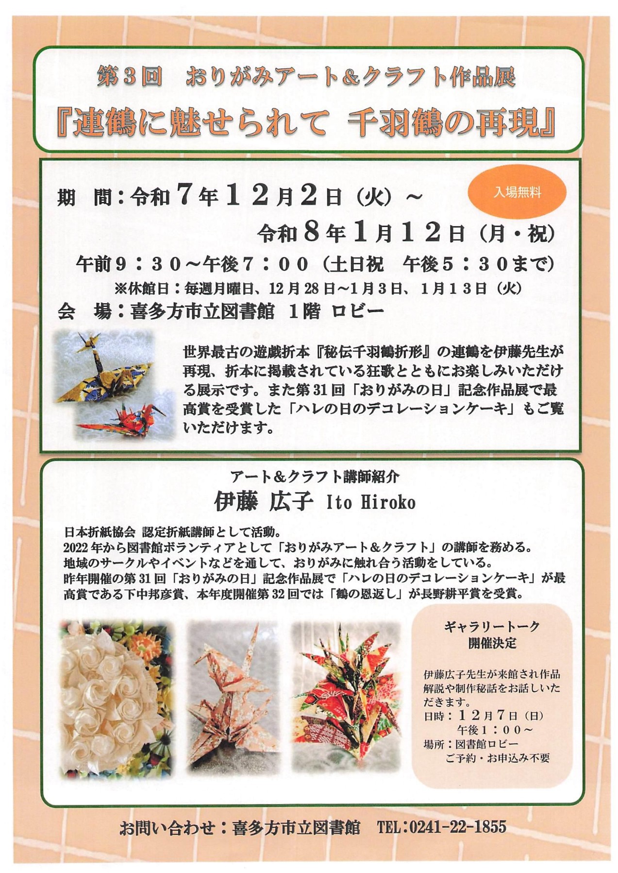 喜多方市立図書館で開催される第3回おりがみアート&クラフト作品展。世界最古の遊戯折本の連鶴再現や、第31回おりがみの日最高賞受賞作品の展示があり、折り紙講師の伊藤広子氏が地域活動も行っている。12月7日にギャラリートークも実施。入場無料。