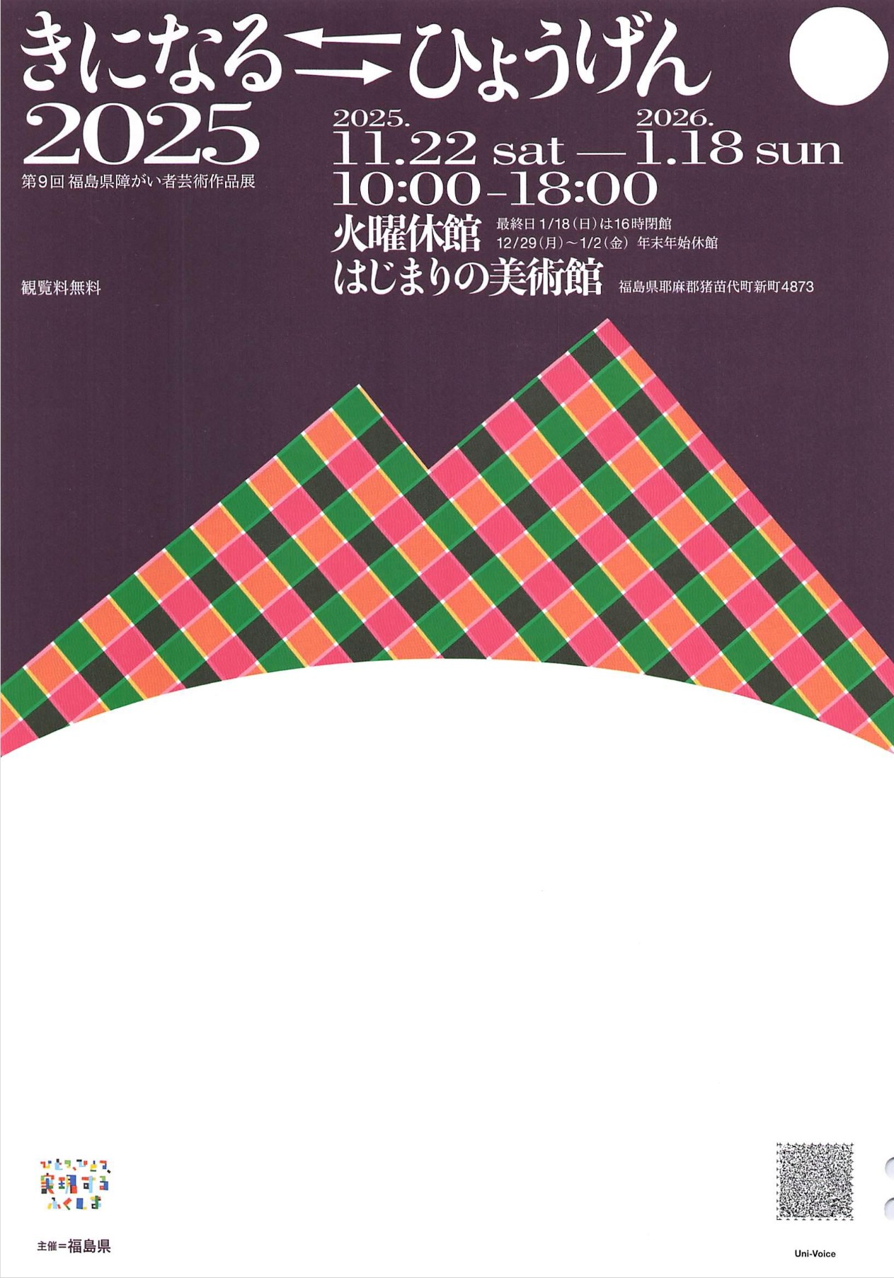 福島県障がい者芸術作品展第9回「きになる⇄ひょうげん2025」は、2025年11月22日から2026年1月18日まで福島県郡山市のはじまりの美術館で開催されます。多様な視点から生まれた作品を通じて、障がいと表現の関係を探る企画展です。観覧無料で火曜休館。