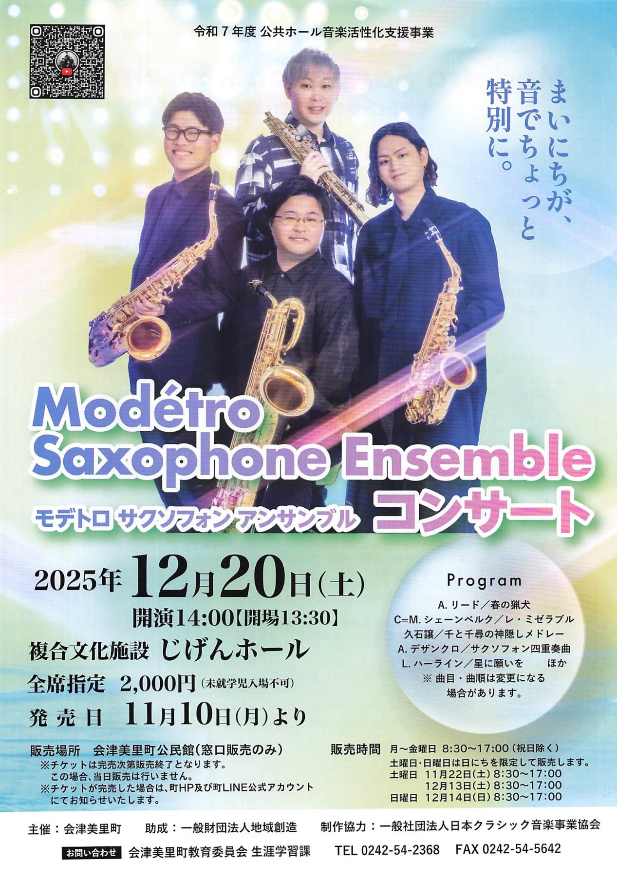 Modétro Saxophone Ensembleのコンサートが、2025年12月20日に会津美里町の複合文化施設じげんホールで開催されます。現代と古典を融合した多彩なサクソフォン演奏が楽しめ、地域交流プログラムの一環として企画されています。全席指定2,000円で、未就学児は入場不可です。