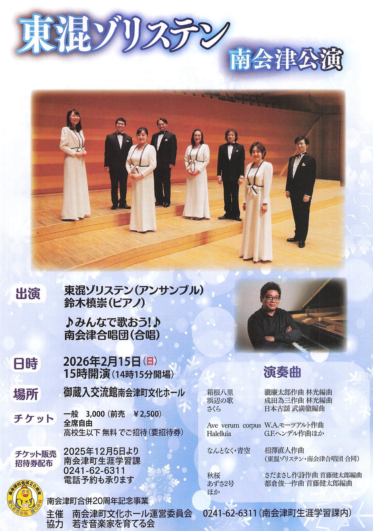東混ゾリステンの南会津公演は2026年2月15日に御蔵入交流館南会津町文化ホールで開催される。ピアニスト鈴木槙崇と南会津合唱団が共演し、日本の抒情歌や多彩なプログラムを披露する。一般3,000円、高校生以下無料。