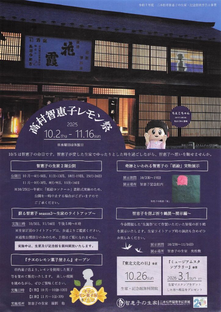 二本松市「智恵子の杜公園」と智恵子記念館では、智恵子の生家や愛を感じる散策路、季節の展示が楽しめます。秋の「智恵子レモン祭」(10/2〜11/16)では特別公開や紙絵展示、限定スイーツが味わえます。