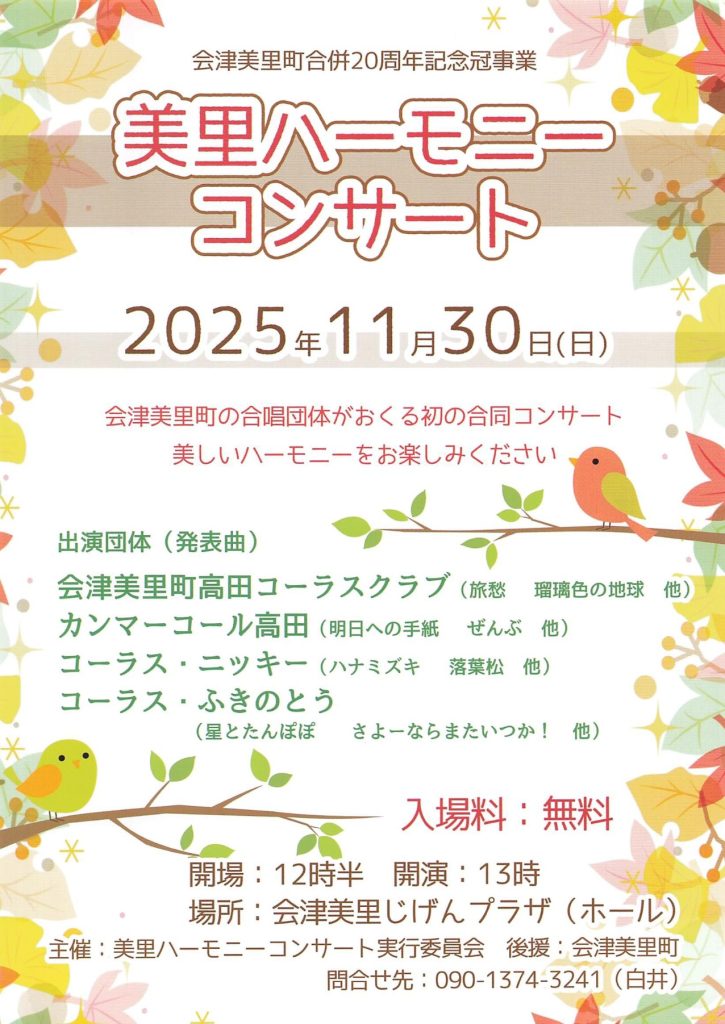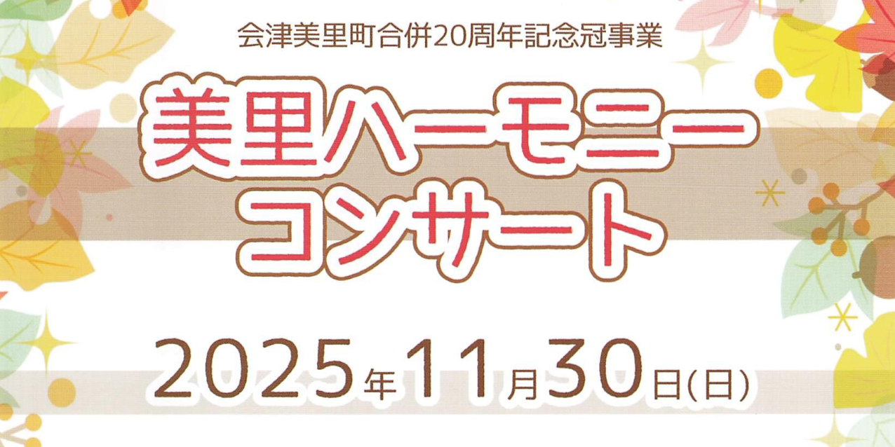会津美里町合併20周年を記念し、町内の合唱団体が一堂に会する初の合同コンサート。コーラス・クラブやカンマーコール高田などが美しいハーモニーを響かせます。秋の午後、心温まる歌声に包まれる音楽のひとときを。入場無料。