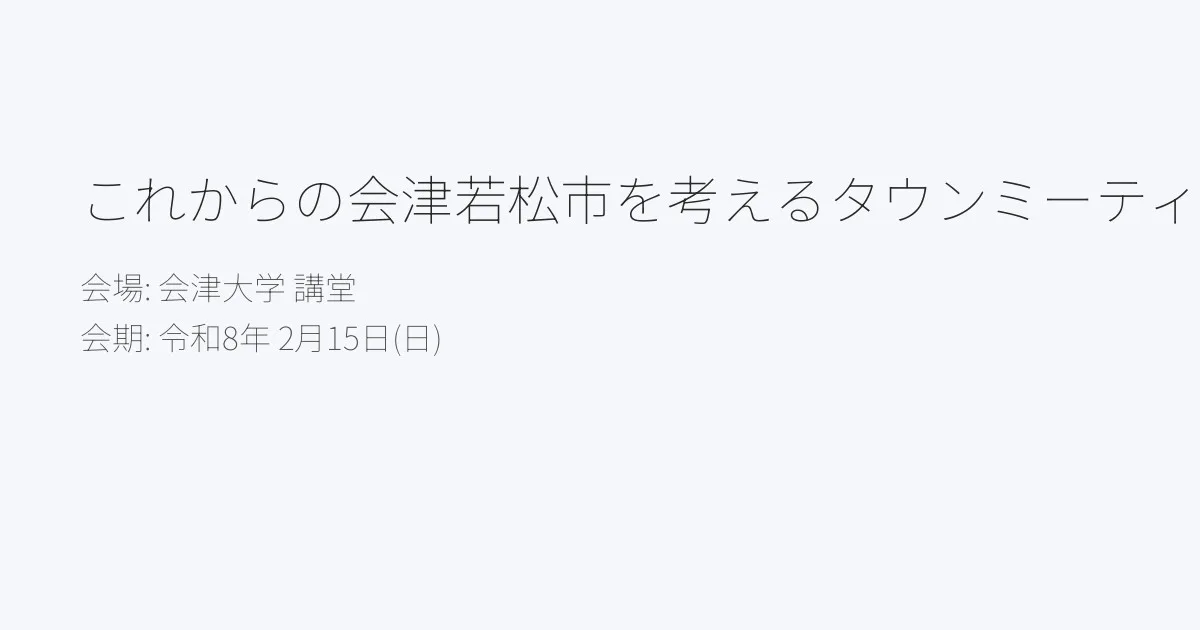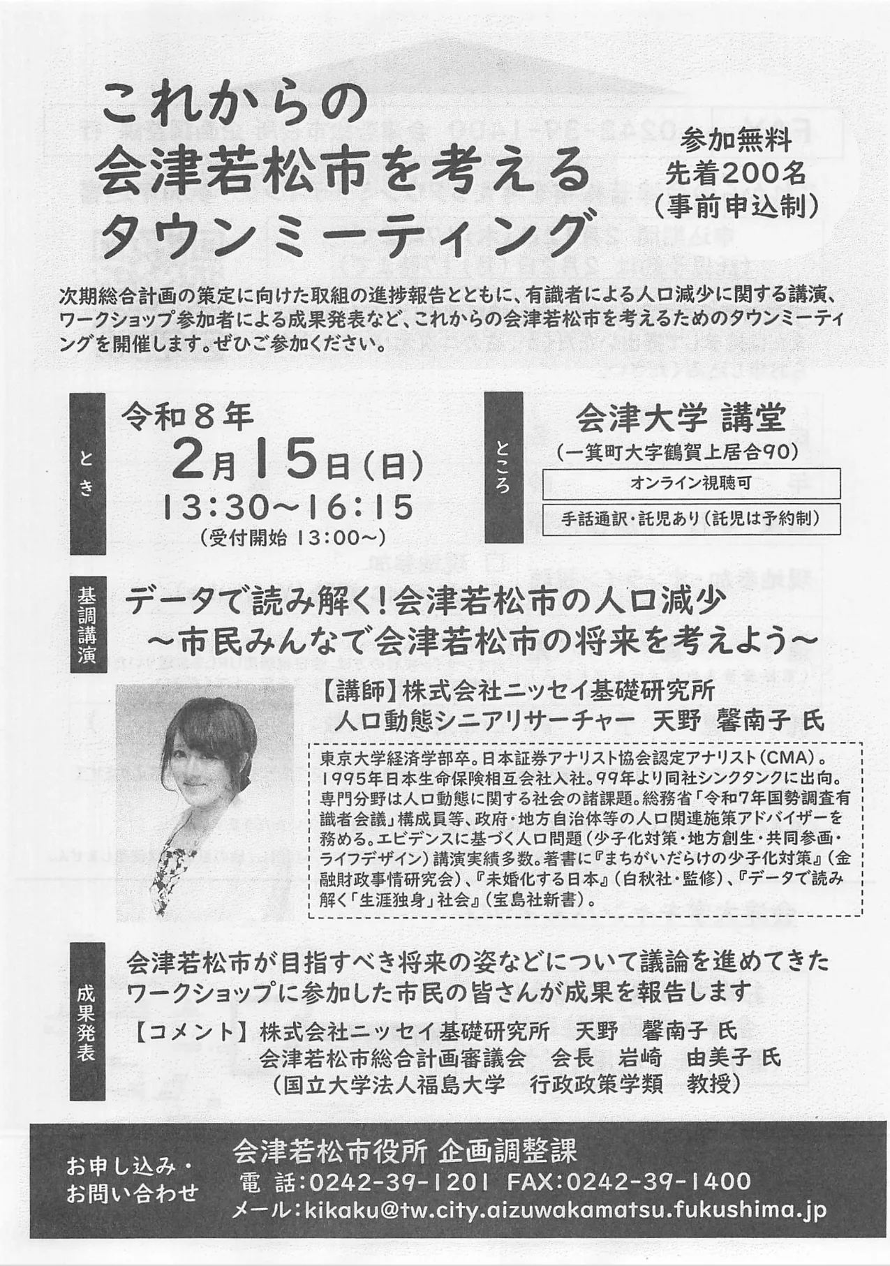 会津若松市の将来を考えるタウンミーティング。人口減少に関する講演やワークショップの成果発表を行います。講師はニッセイ基礎研究所の天野馨南子氏。オンライン視聴や手話通訳、託児サービス(要予約)も利用可能です。参加無料、先着200名(事前申込制)。