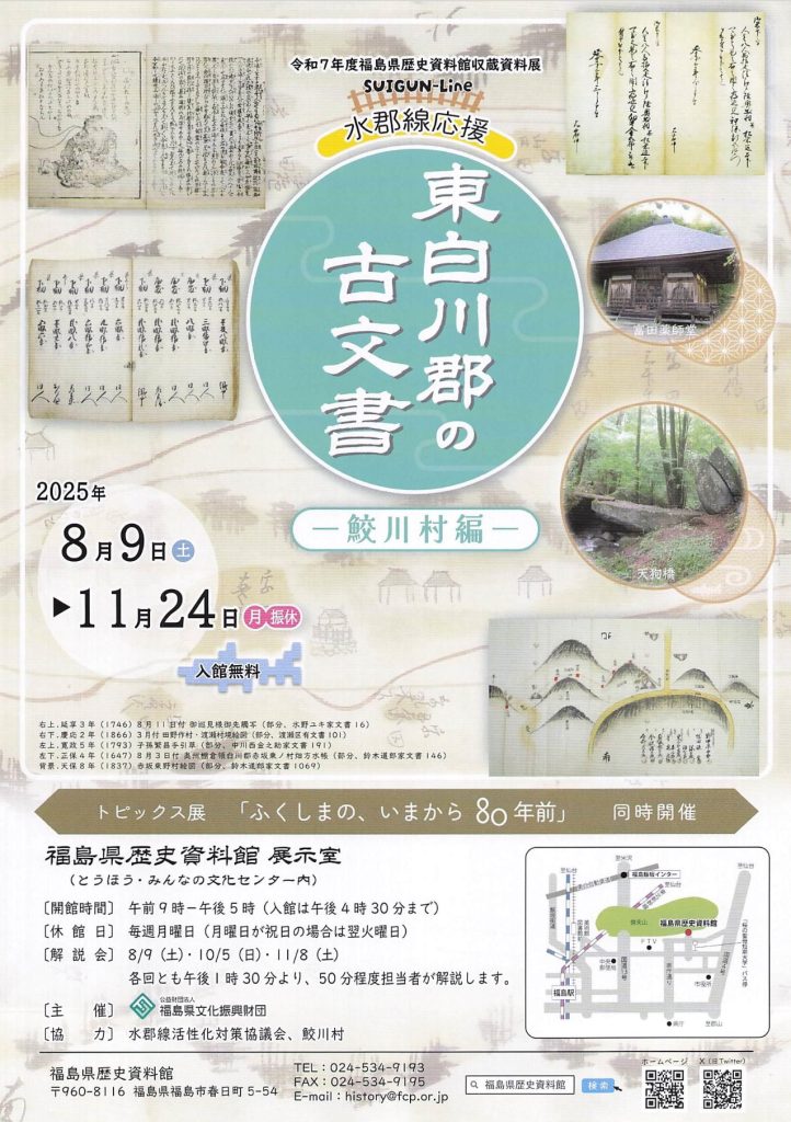江戸から明治期にかけて鮫川村にゆかりのある古文書を展示。棚倉藩や幕府巡見使、地域の村々の暮らしや境界争いなど、当時の政治・社会・文化を伝える貴重な記録を紹介します。トピックス展も同時開催。