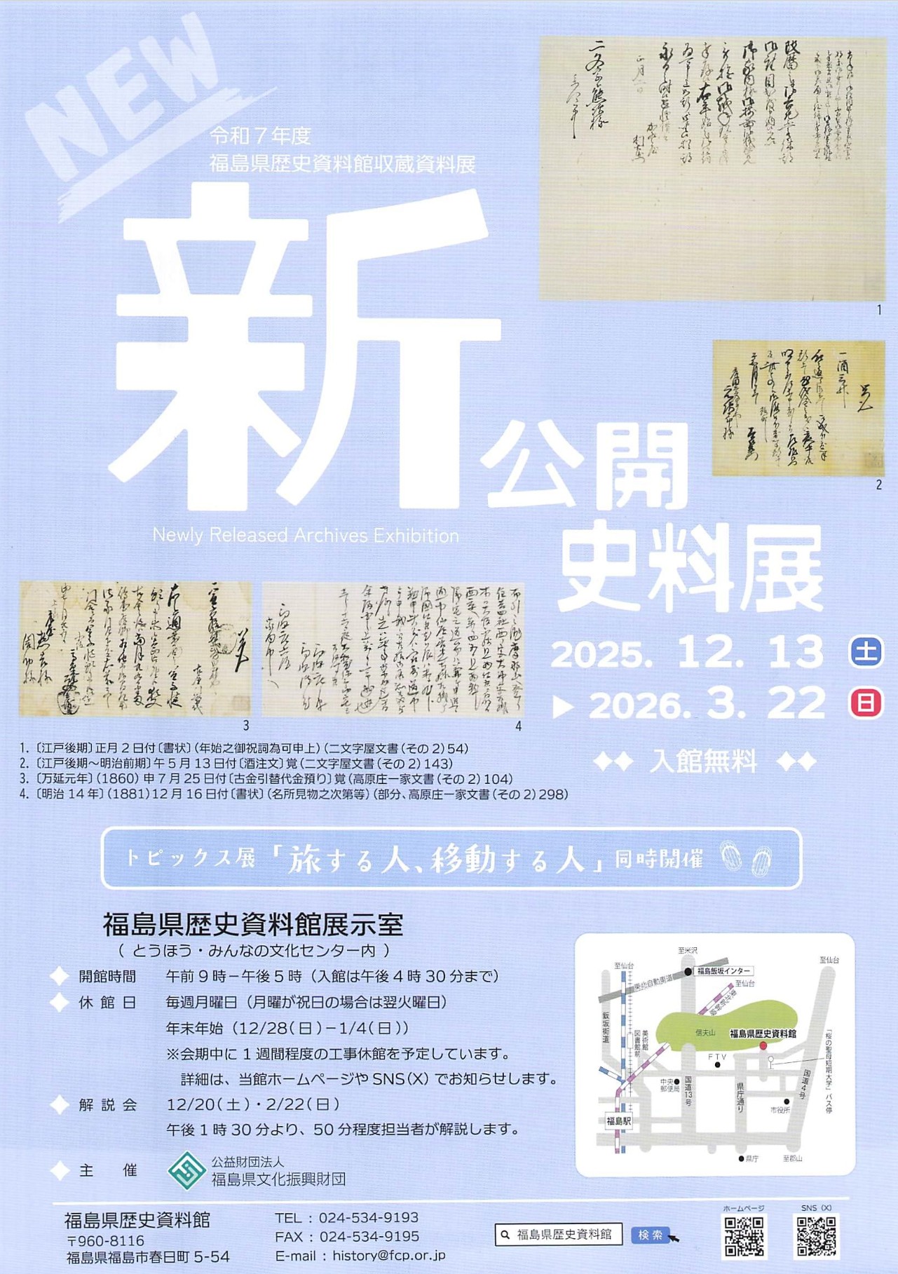 福島県歴史資料館にて令和7年度新公開史料展が開催される。江戸後期から明治前期にかけての貴重な文書を展示し、地域の歴史と文書の魅力を伝える。入館無料で2025年12月13日から2026年3月22日まで。併せて「旅する人、移動する人」というテーマのトピックス展も実施。