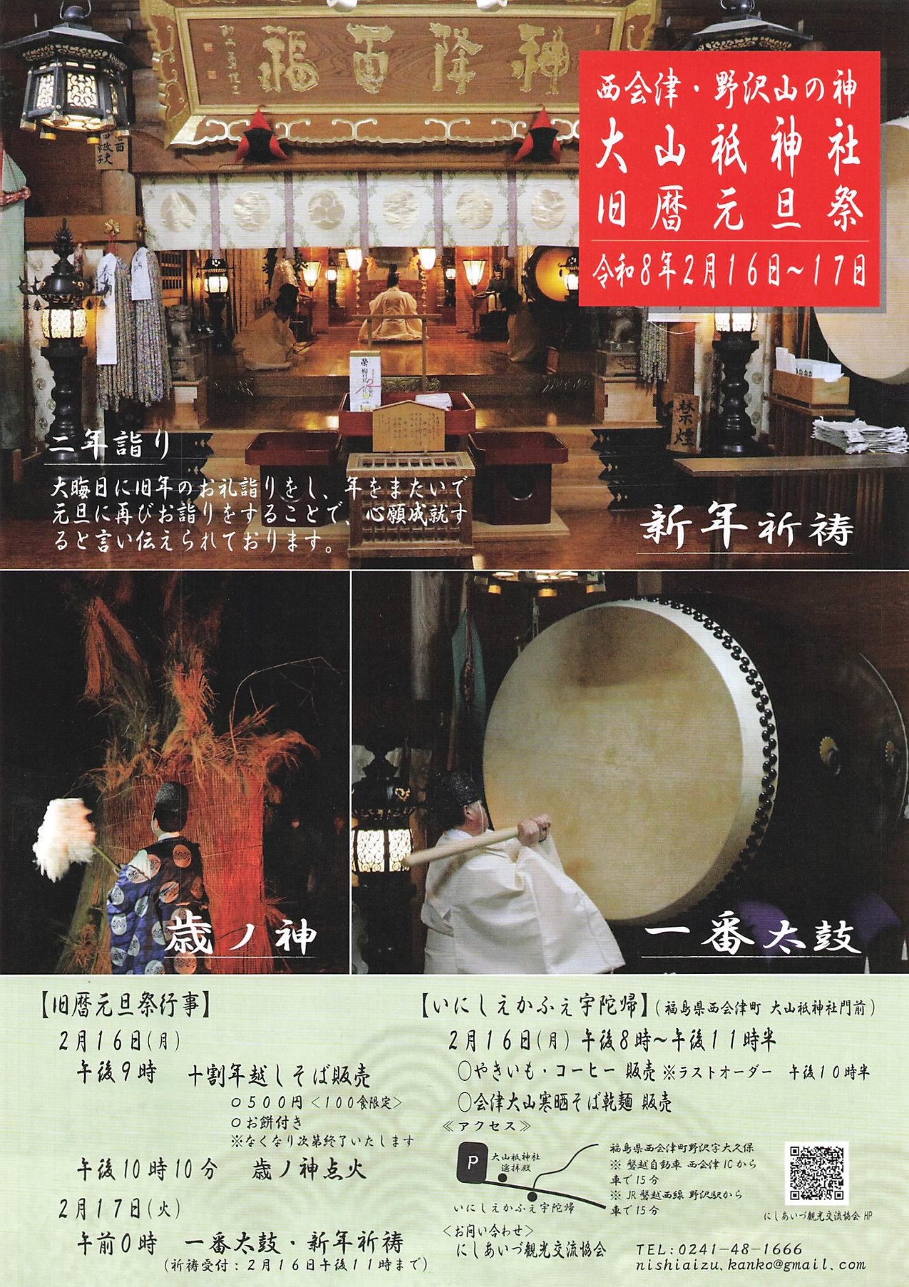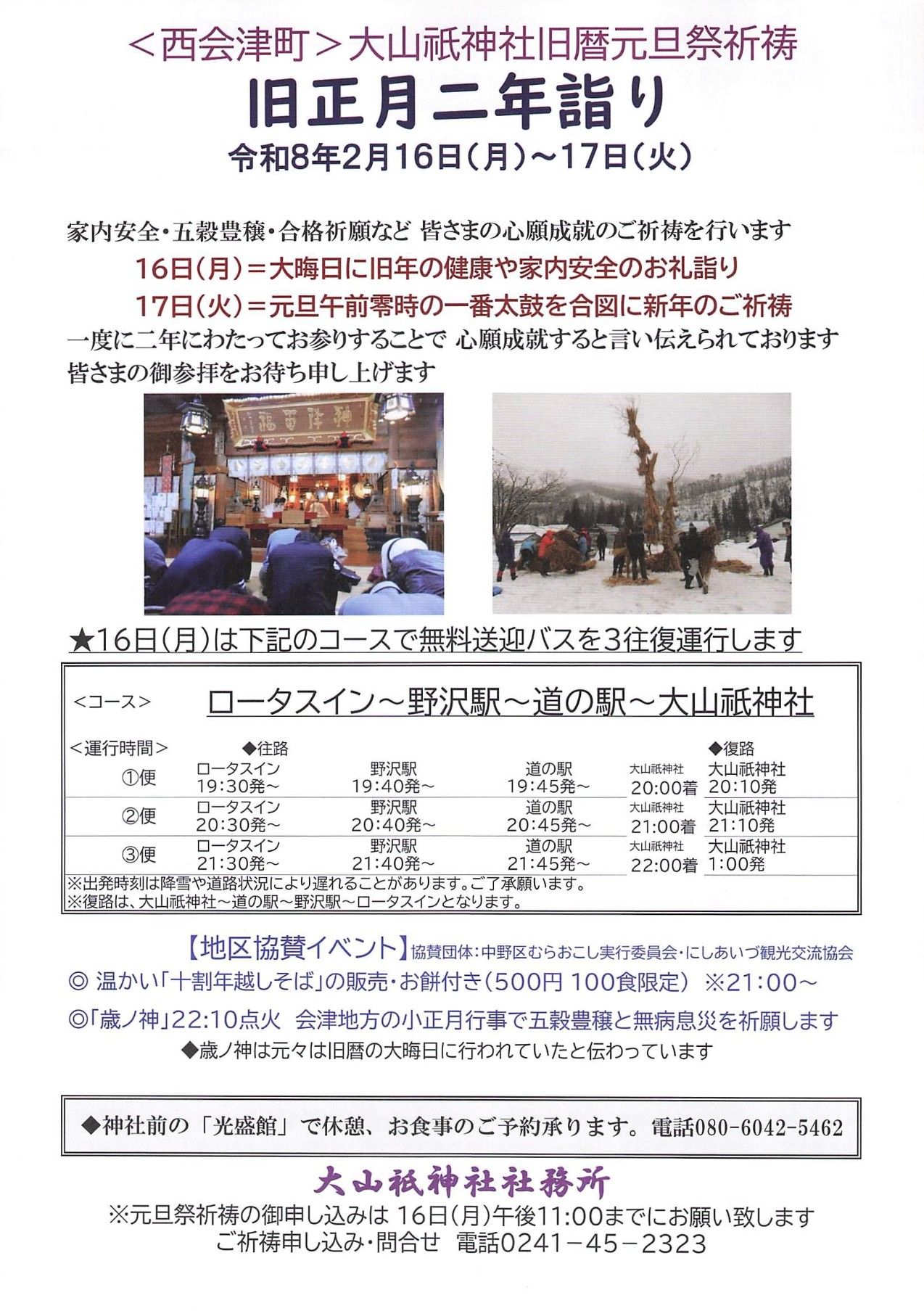 西会津町の大山祇神社で行われる旧暦元旦祭祈祷「旧正月二年詣り」。家内安全・五穀豊穣・合格祈願などの祈祷を行い、16日は大晦日に旧年の健康や家内安全のお礼詣り、17日は元旦午前零時の一番太鼓を合図に新年のご祈祷を行う。16日はロータスイン〜野沢駅〜道の駅〜大山祇神社間で無料送迎バス3往復運行。地区協賛イベントとして温かい十割年越しそばやお餅の販売、歳ノ神22:10点火なども実施。神社前の光盛館で休憩や食事予約も可能。