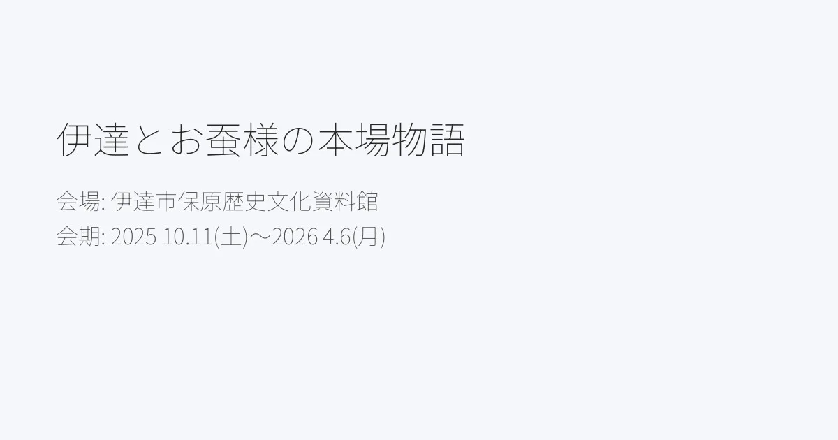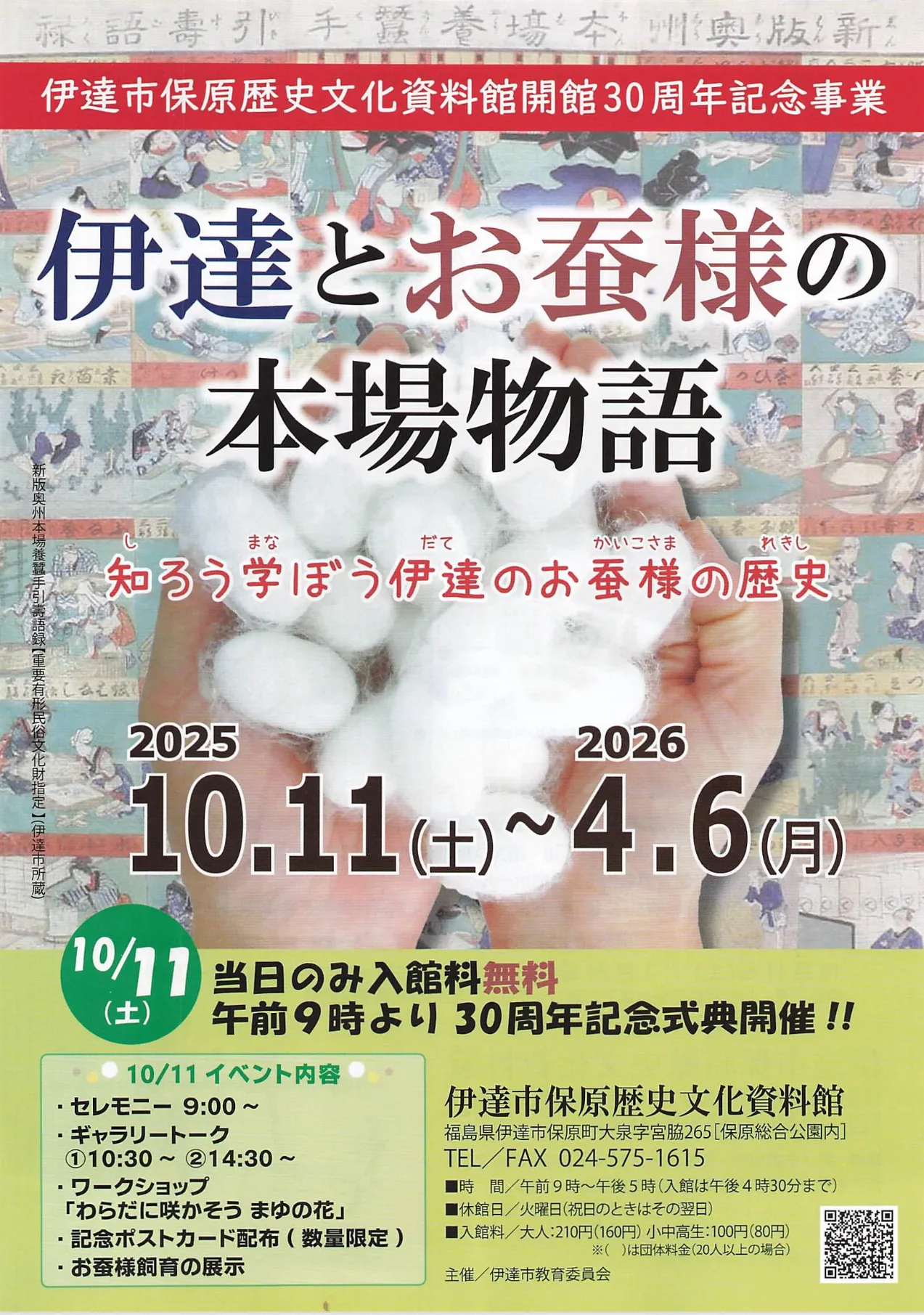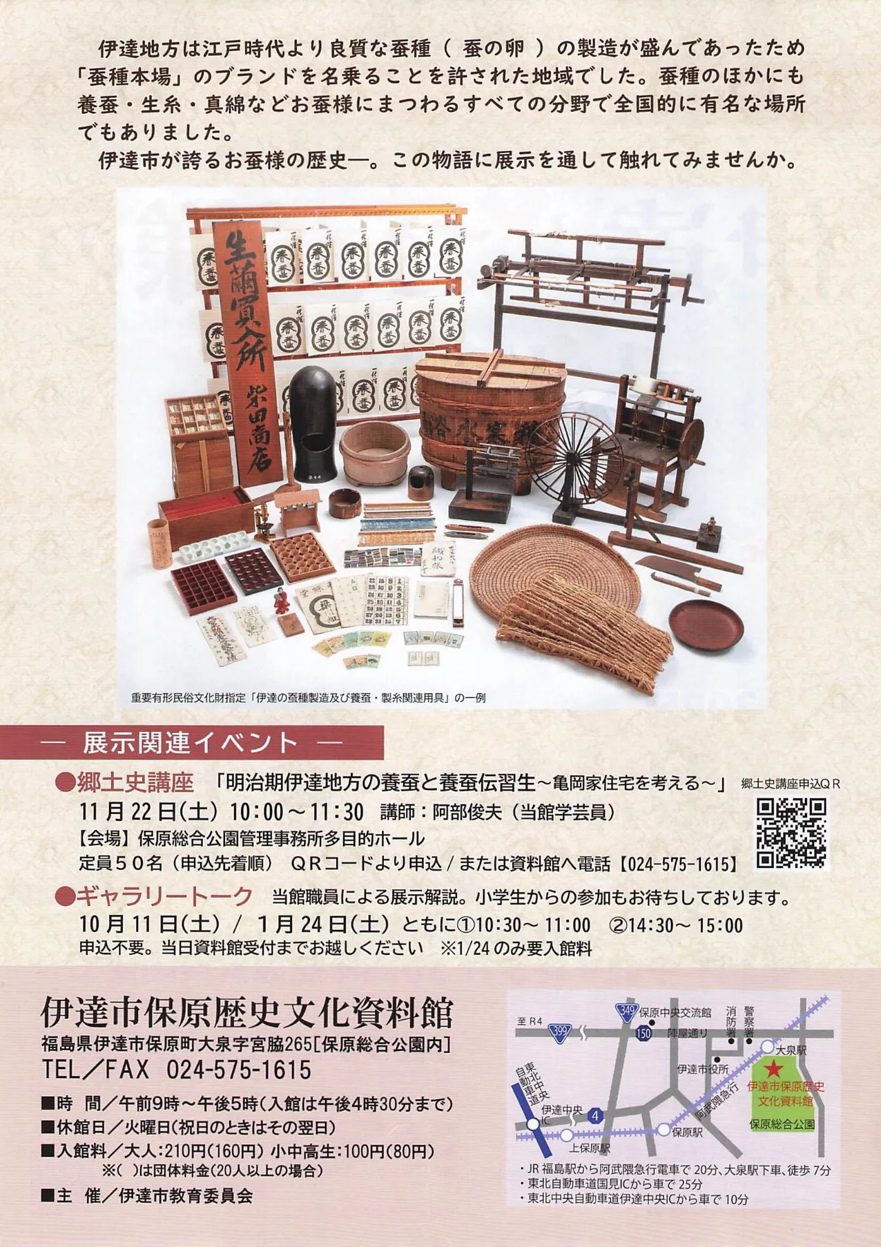 伊達地方は江戸時代より良質な蚕種の製造が盛んで、「蚕種本場」のブランドを許された地域でした。本展では伊達市が誇るお蚕様の歴史を資料や道具の展示を通して紹介します。会期中には郷土史講座「明治期伊達地方の養蚕と養蚕伝習生〜亀岡家住宅を考える〜」(11月22日 10:00〜11:30、会場:保原総合公園管理事務所多目的ホール、定員50名・申込先着順)や、学芸職員による展示解説ギャラリートーク(10月11日・1月24日 各日10:30〜11:00/14:30〜15:00)など関連イベントも開催されます。10月11日にはセレモニー、ギャラリートーク、ワークショップ「わらだに咲かそう まゆの花」、記念ポストカード配布、お蚕様関連の展示が行われます。