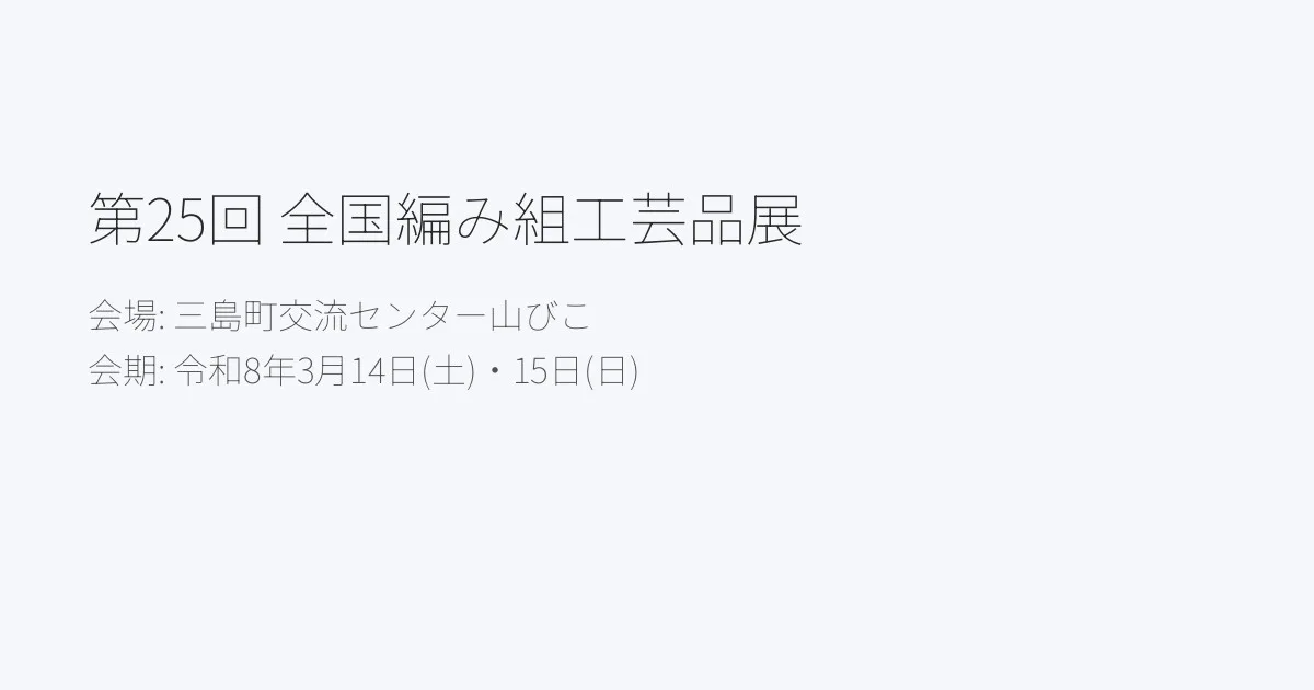 第25回全国編み組工芸品展が、令和8年3月14日(土)・15日(日)に福島県三島町交流センター山びこで開催されます。全国から集められた編み組工芸品の展示や、作品募集も行われます。出品料は5,000円です。主催は奥会津三島組紐振興協議会です。