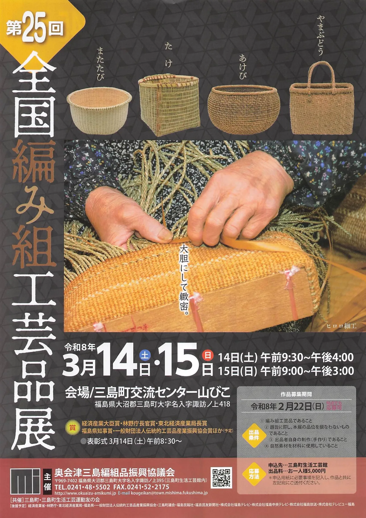 - 後援:後援] 経済産業省・林野庁・東北経済産業局長賞、福島県知事賞・一般財団法人伝統工芸品産業振興協会・三島町議会・福島民報社・株式会社福島中央テレビ・株式会社福島放送・株式会社テレビユー福島