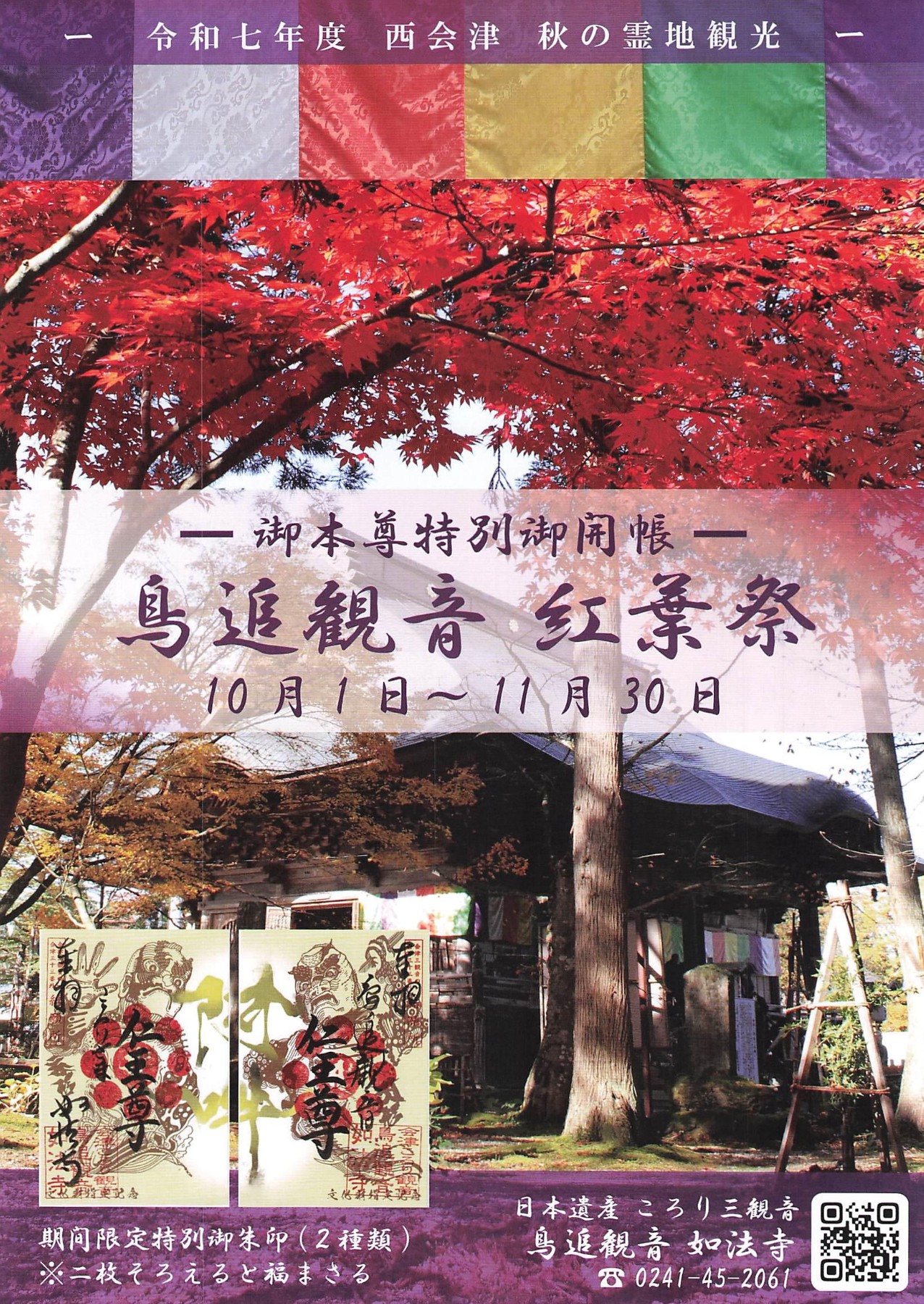 西会津町の霊場・鳥追観音如法寺で、紅葉の美しい季節にあわせた「鳥追観音 紅葉祭」が開催。境内を彩るもみじとともに、特別御朱印(2種類)も頒布されます。歴史ある観音堂で、秋の静寂と彩りを感じるひとときを。