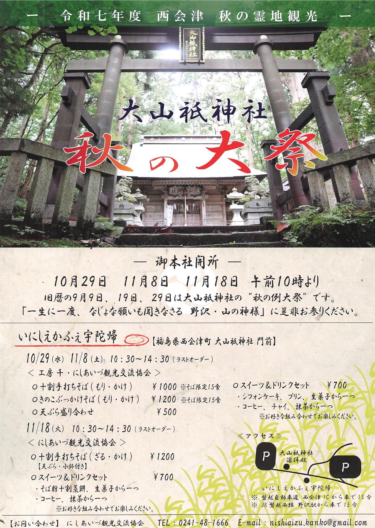 霊験あらたかな野沢・大山祇神社で行われる秋の例大祭。旧暦9月の祭日に合わせ、10月29日・11月8日・11月18日に執り行われます。参拝とともに、門前ではそば打ち体験やスイーツセットなど地元の味覚も楽しめます。