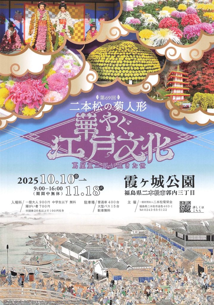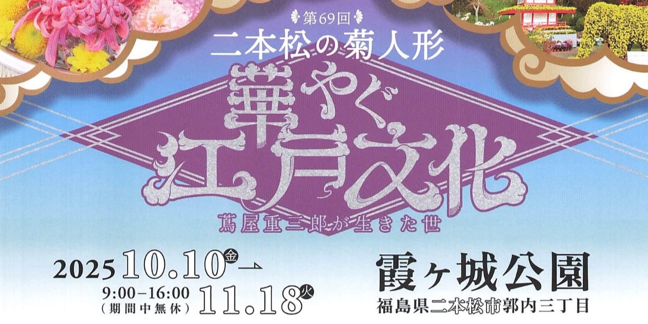 日本三大菊人形のひとつとして知られる秋の風物詩。今回は「華やぐ江戸文化」をテーマに、葛飾北斎や歌舞伎など江戸の華やぎを再現。約1万鉢の菊が彩る園内で、伝統と美の競演を楽しめます。