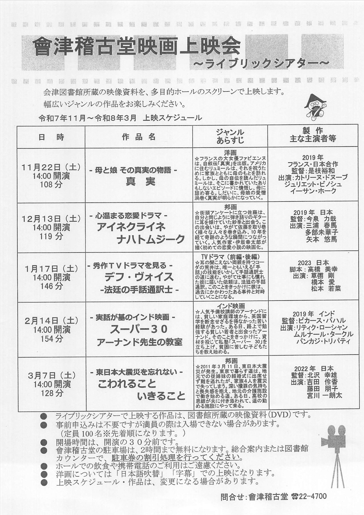 會津図書館所蔵の映像資料を多目的ホールのスクリーンで上映するイベント。幅広いジャンルの作品を楽しめる。今回は実話が基のインド映画「スーパー30 アーナンド先生の教室」を上映。開場は開演の30分前、先着100名。飲食や携帯電話の利用は不可。洋画は日本語字幕で上映。定員に達した場合は入場できない。