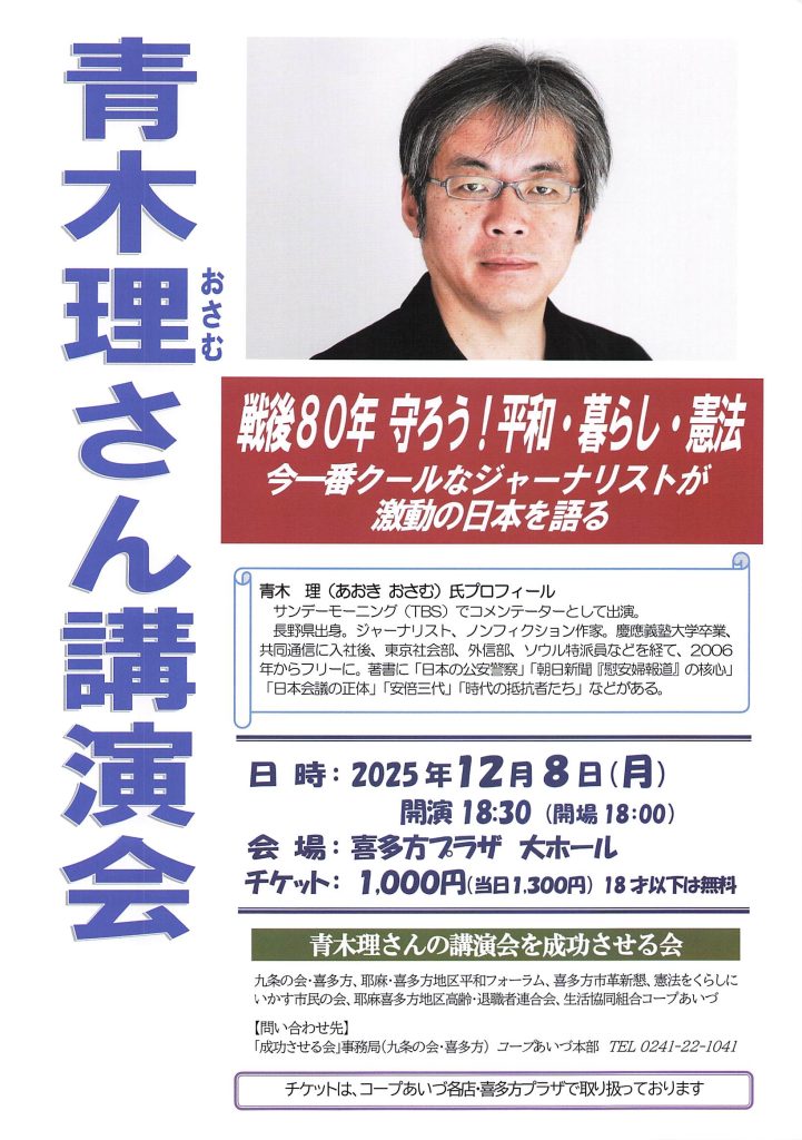 青木理氏の講演会が2025年12月8日に喜多方プラザ大ホールで開催される。戦後80年をテーマに平和・暮らし・憲法について語る。入場料は前売1000円、当日1300円、18才以下無料。九条の会や地元市民団体などが主催。