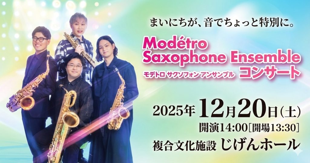 Modétro Saxophone Ensembleのコンサートが、2025年12月20日に会津美里町の複合文化施設じげんホールで開催されます。現代と古典を融合した多彩なサクソフォン演奏が楽しめ、地域交流プログラムの一環として企画されています。全席指定2,000円で、未就学児は入場不可です。 -