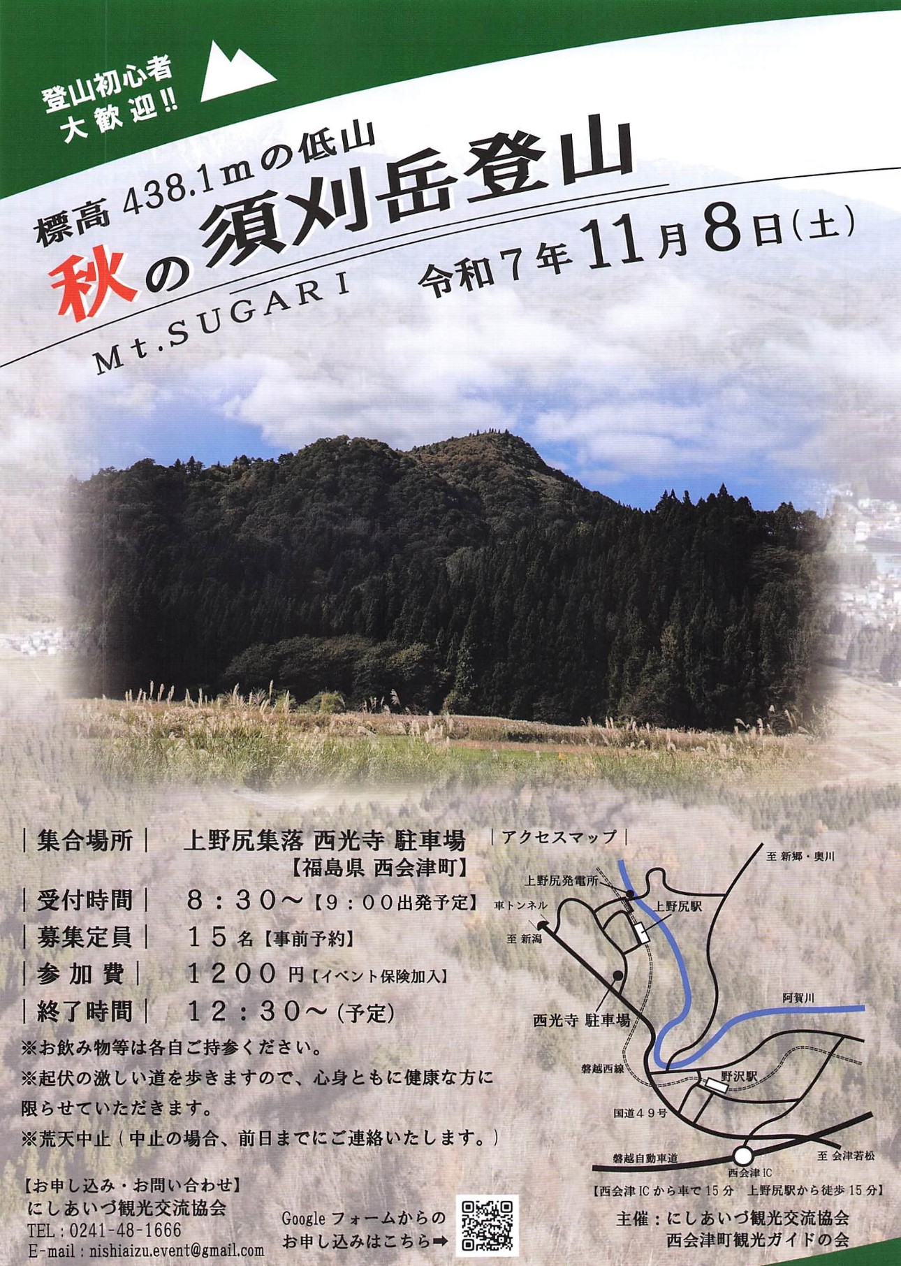 初心者も気軽に挑戦できる低山・須刈岳で、秋の自然を楽しむ登山イベントが開催されます。上野尻集落の西光寺駐車場に集合し、のんびりとした山歩きと紅葉を満喫。少人数制で安全に楽しめる内容です。