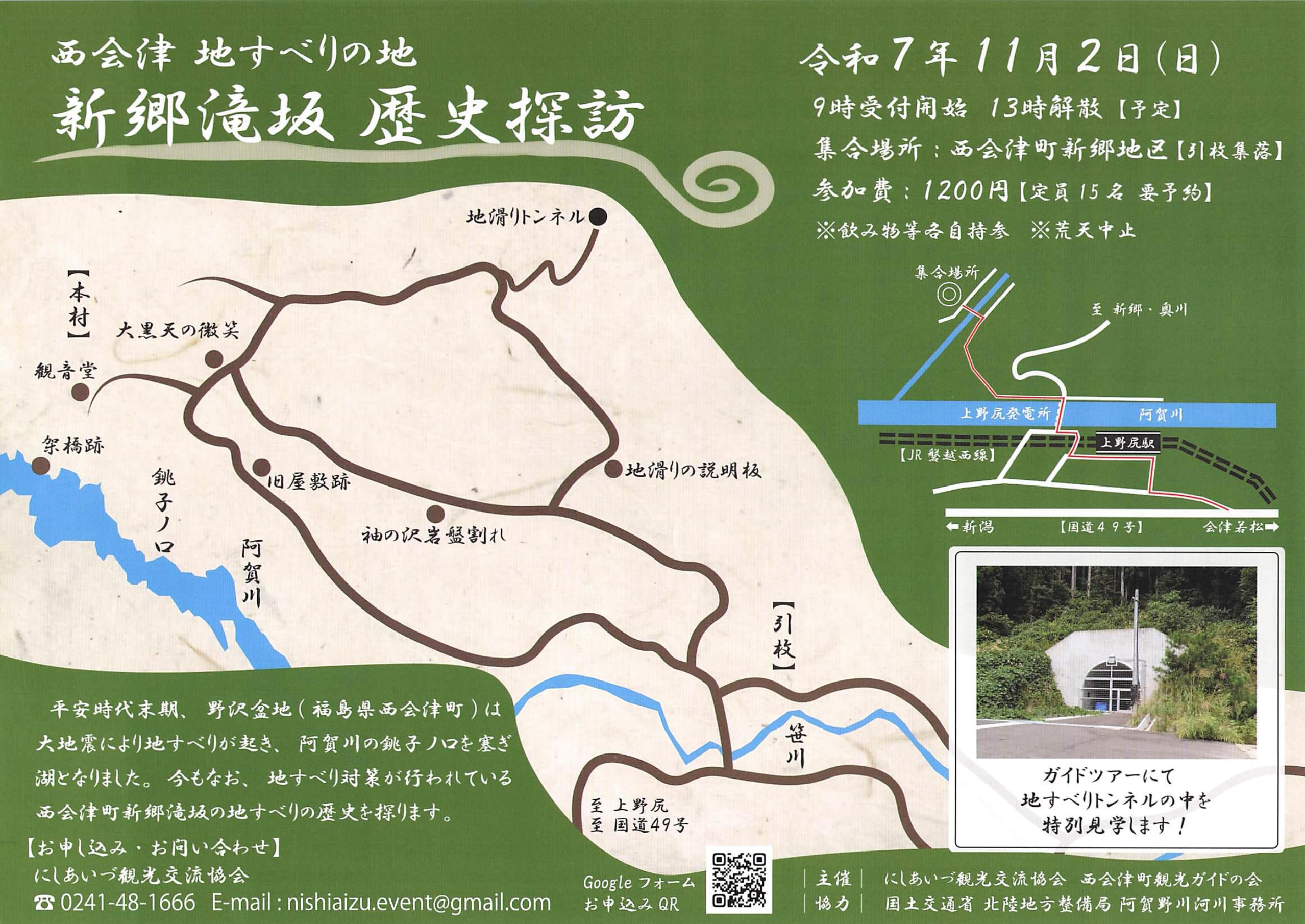 平安時代末期に発生した「地すべり地」として知られる西会津町・新郷滝坂地区を歩きながら、阿賀川沿いの自然と歴史を学ぶ探訪会。地すべりトンネルの特別見学も実施され、専門ガイドが案内します。