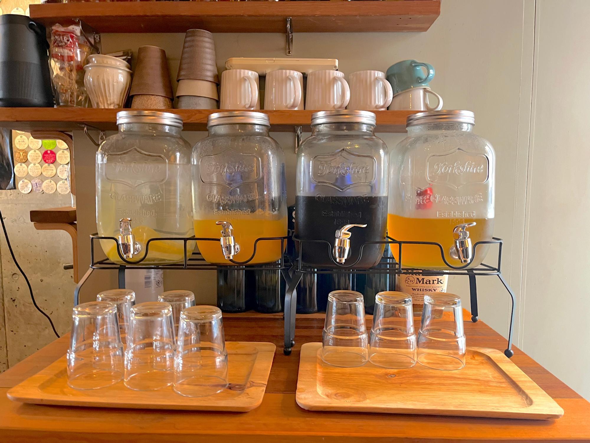 ランチのセットでドリンクバーが利用できます。左から、レモン水、オレンジジュース、アイスコーヒー、緑茶。アイスは飲み頃温度。他にホットでコーヒー、紅茶が飲めます。