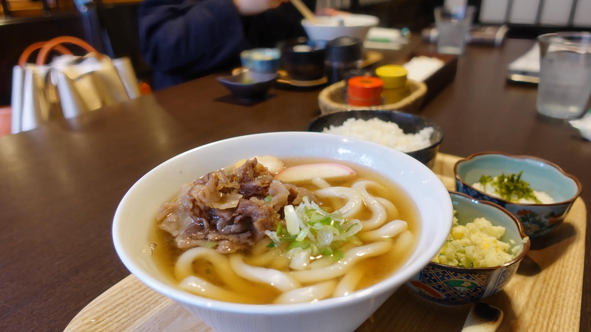 ベースのうどん出汁は「藻塩のあさり磯うどん」と同じと思いますが、甘辛く焼かれた牛肉の味と相まって、やや甘め、辛めな味(藻塩のあさり磯うどんと比べて)となっています。モチモチの歯切れの良いうどん。