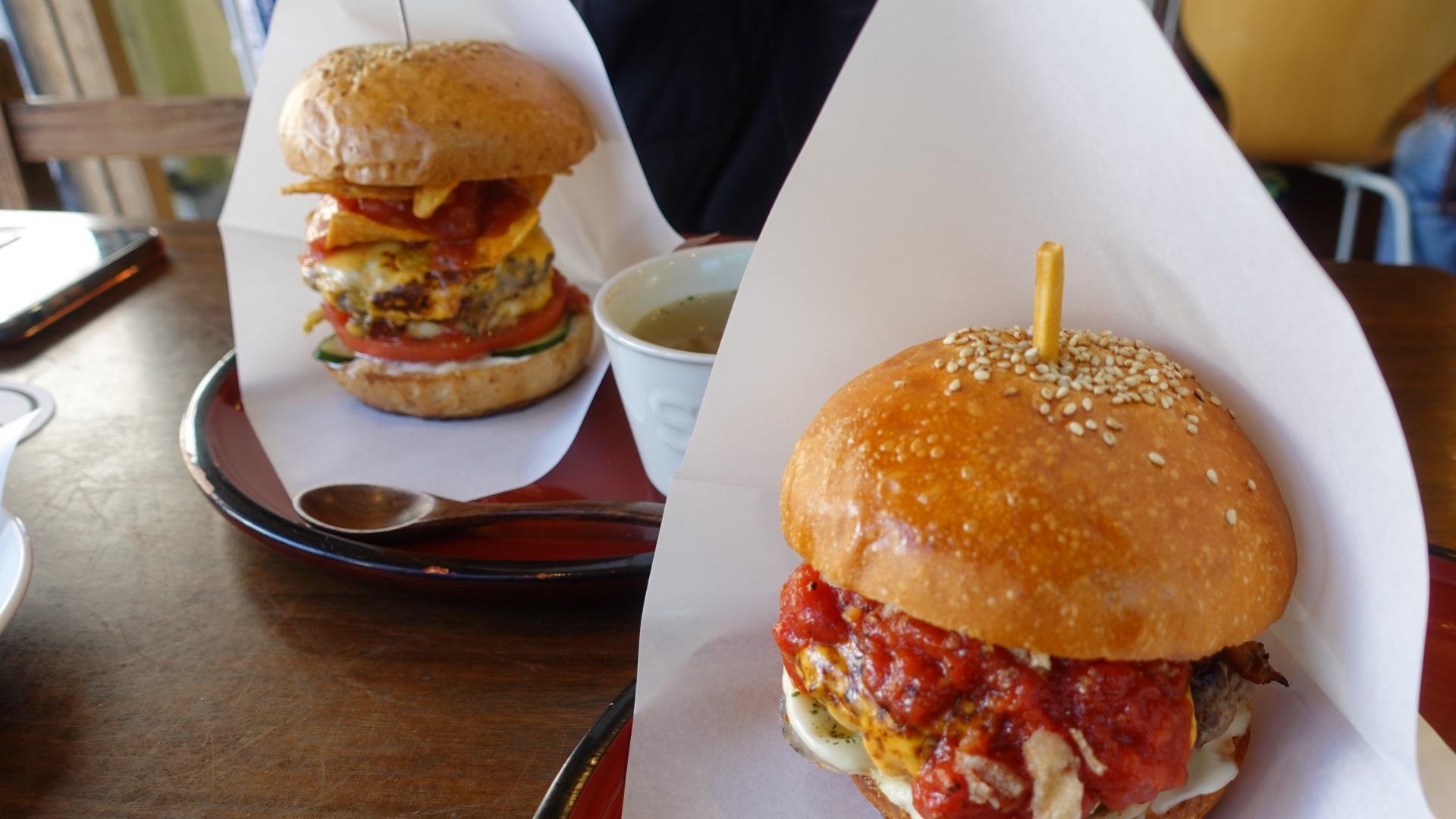 背あぶり山バーガーは、オニオン全粒粉バンズにサルサソース、トルティーヤチップスがアクセントのハンバーガー。玉子焼きも合います。小顔サイズです。丸かぶりはできません。