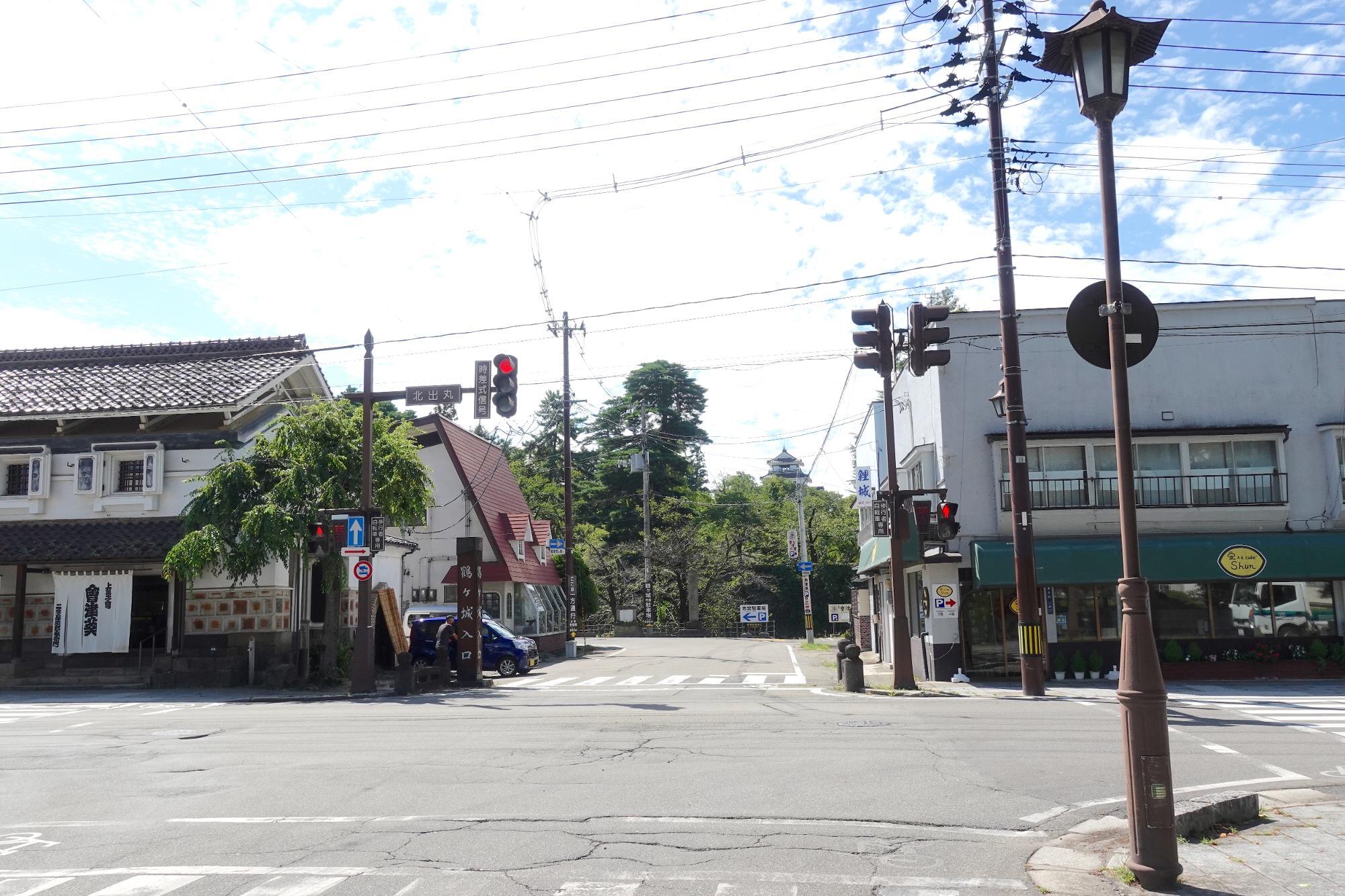 甲賀町通りから、大手口(正門跡)を見たところ。甲賀町通りから向かえば直進ですが、東西からだとつい通りすぎる事もあります。