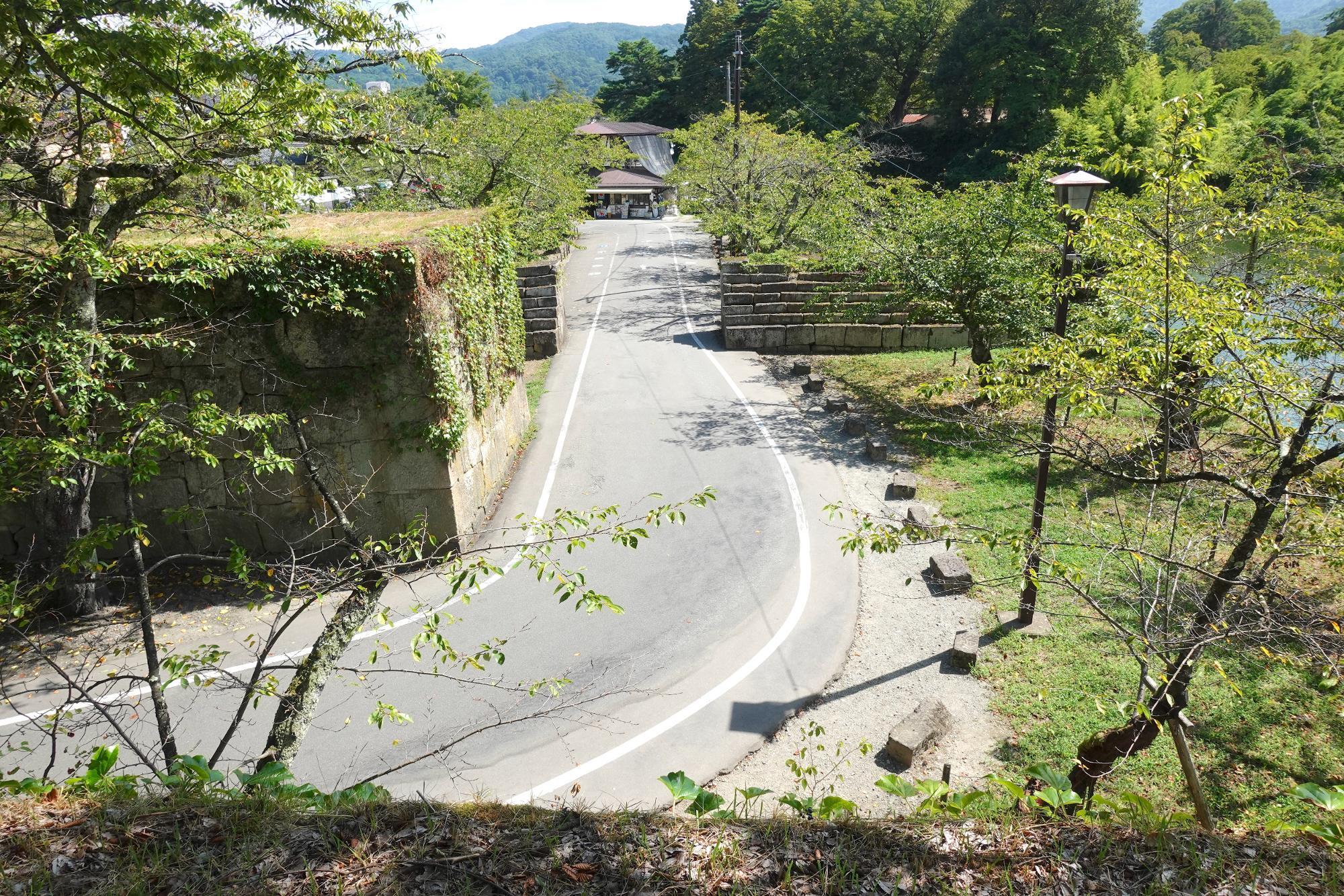 地図を見ると、国道118号線から入りたくなるのですが、一方通行の出口になるので進入できません。最近のナビだと、正しく案内してくれるかも知れませんが、「大手口」「追手門」あたりでナビ案内が終了して困るかも、しかし、道なりに進めばOKです。最後の左折を誤ると、出口に向かってしまうので、その点だけ注意です。