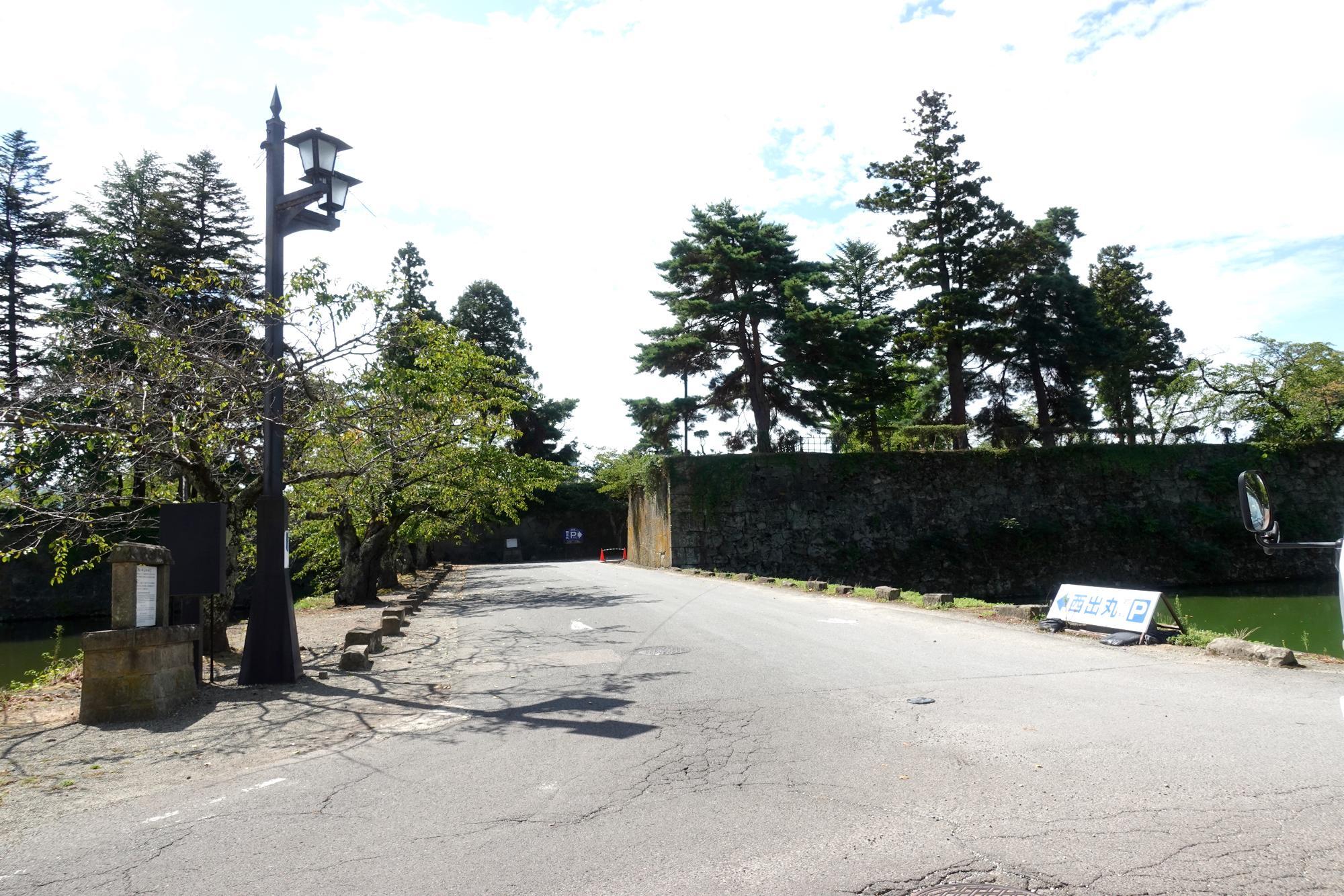 西出丸駐車場(有料)へ車で向かう場合、入口は北の「大手口」で一方通行になります。