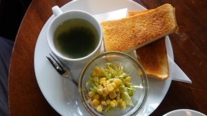 休みの日に限らず、いつも朝食を摂らないのですが、今日はモーニング狙いなので特別。もっとも旅館宿泊とかすると、きっちり食べらるので食べられないというわけではありません。綺麗なトースト。サラダもしゃくしゃく美味しい。スープはわかめスープ。