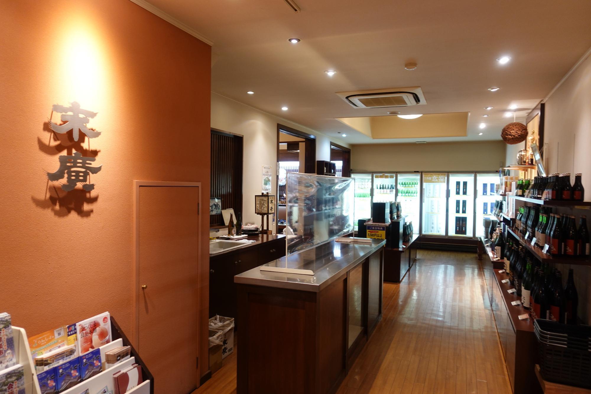 酒蔵ショップは出入り口が2箇所。こちらから入って、反対側(レジ前)を抜ける動線。スクリーンがあるのは試飲所。酒蔵見学の後で試飲を勧められましたが、運転手はダメよ、です。