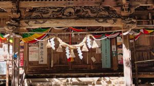 しめ縄やしめ飾りが眩しい。紙で作ったしめ飾りは「紙垂」(しで)と呼びます。紙垂の意味は諸説あります(いろいろなところで使われるので)。しめ縄に垂らすのは邪悪なものを追い払ったりするとかの意になるかと思います。