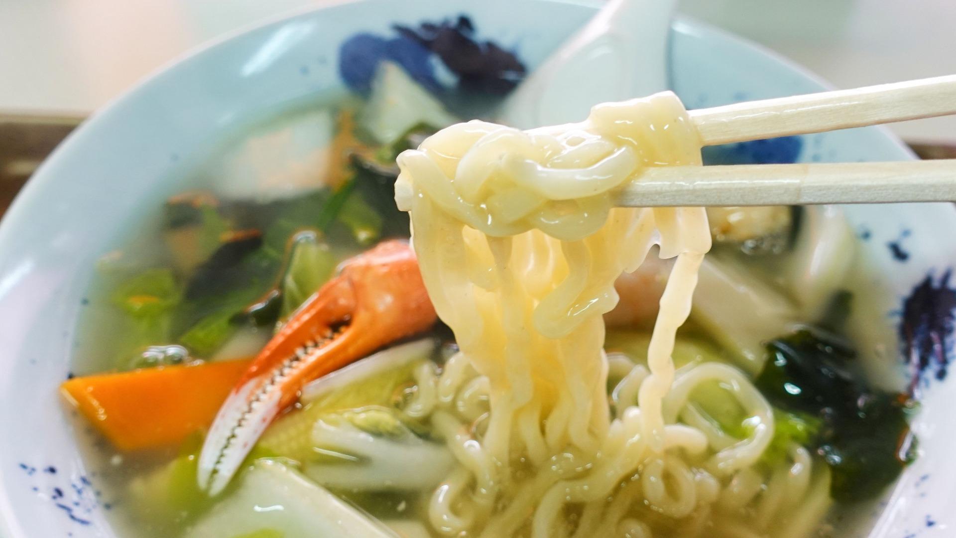 メニューには「五目ラーメン」もあって2択から「海鮮ラーメン」にしました。会津では「海鮮」ラーメンは珍しいです。カニの爪が入って思いの外に豪華。