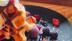 ハーフがあればフルもあるわけですが、ハーフはワッフルの分量がフルの半分というお話。写真は「ハーフ」です。その名の通り、フローズンベリーがあしらわれて、冷え冷えベリーが暑い日には嬉しい。