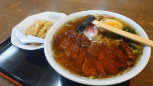 メニューに「当店特製」とあったのが、「やなぎ麺」と「盛合わせ麺」。「やなぎ麺」は上の写真のもので、トンカツがトッピング。「盛合わせ麺」は、トンカツとチャシューのトッピングとなります。(注文前に聞きました)しばし悩み、今回は店の名を冠した「やなぎ麺」としました。