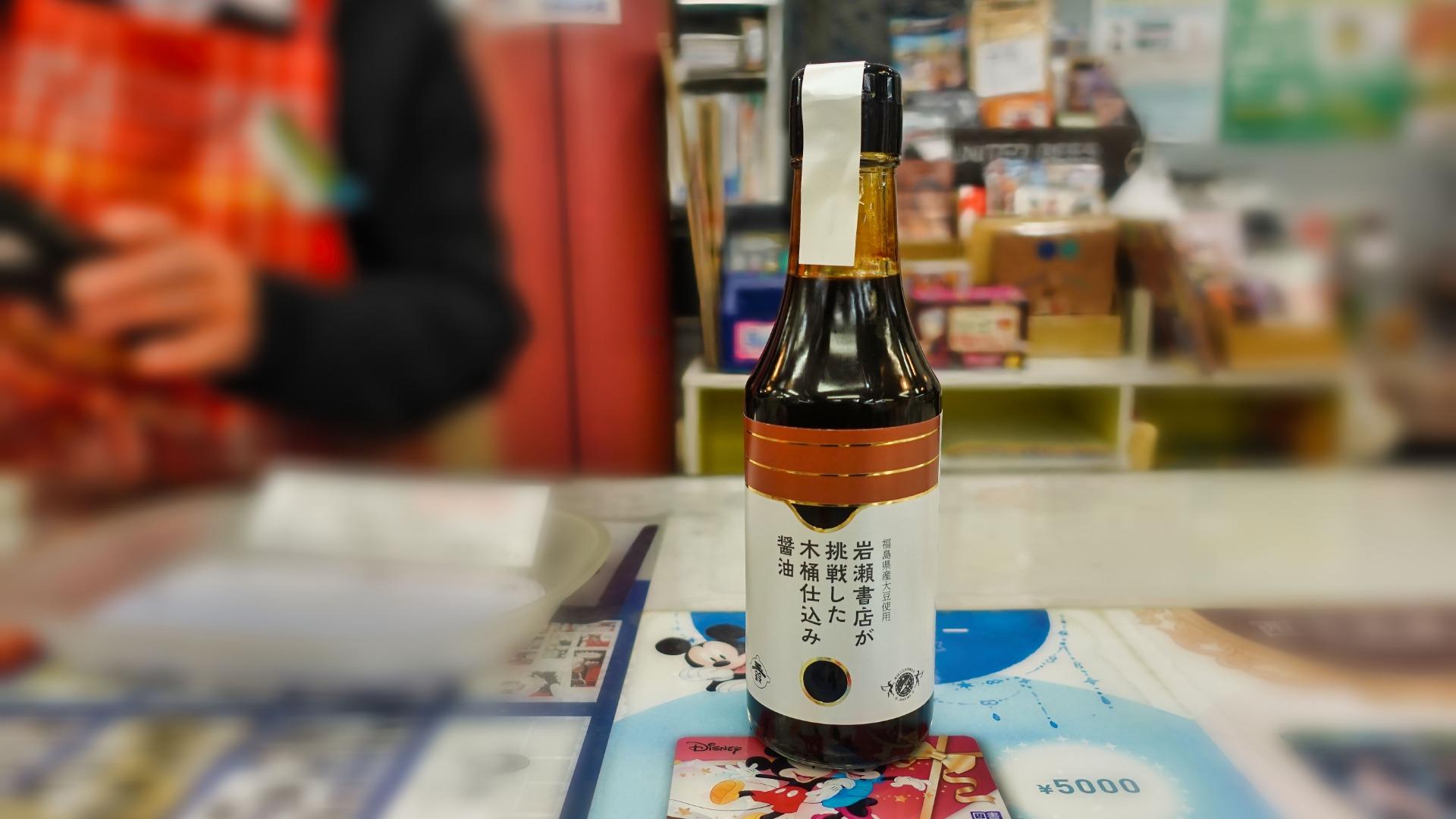 書籍でもなければ、文具、その他小物ですらない「醤油」が売られていました。その名も「岩瀬書店が挑戦した木桶仕込み醤油」。これが醤油の名称。少し長いですけど、お気になされずに。