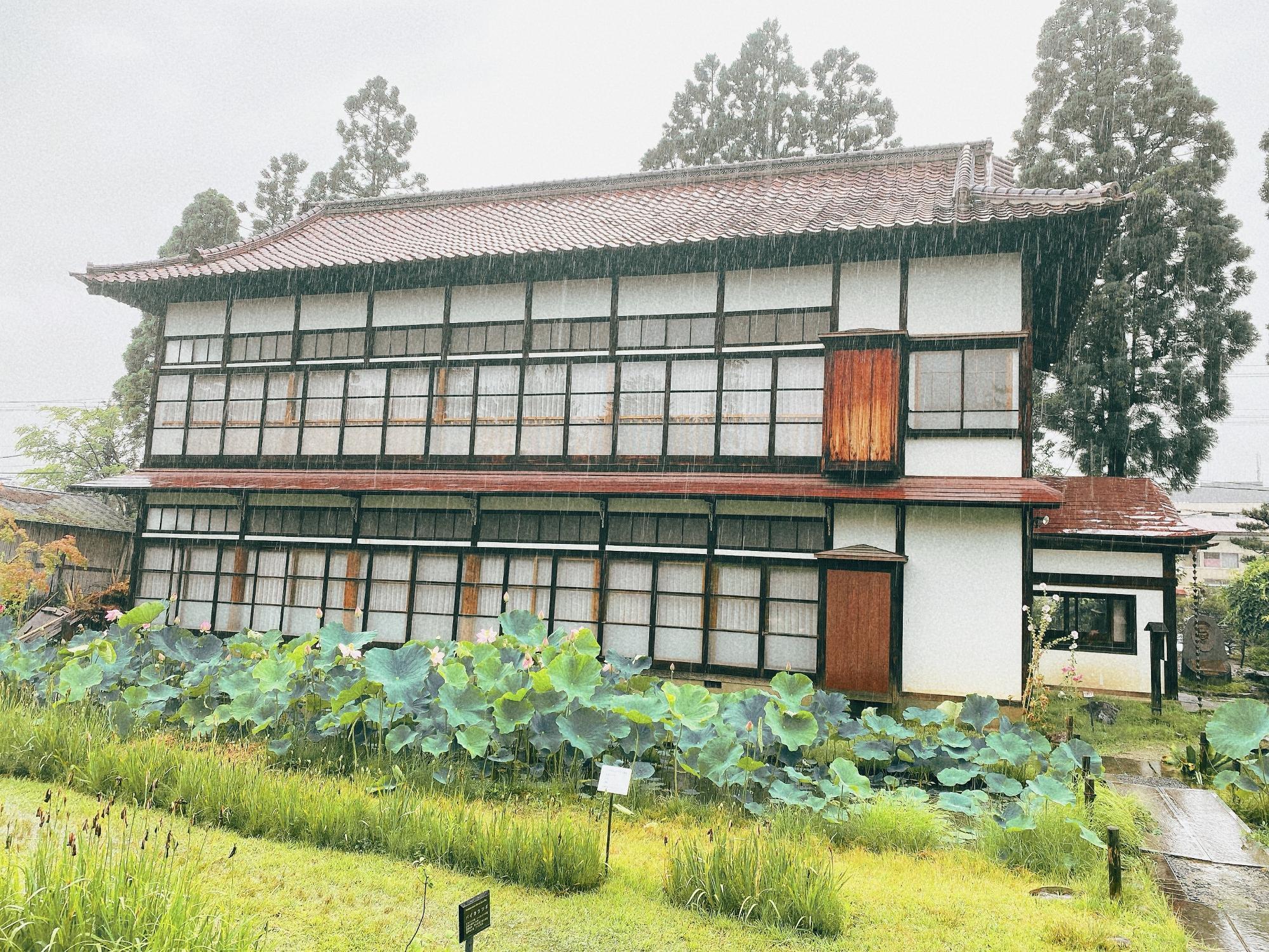 門を潜って左手に建物があって、蓮はその建物の前。建物は重陽閣と呼ばれ、昭和3年(1928)1月、秩父宮雍仁(やすひと)殿下と松平節子姫(最後の会津藩主、松平容保の孫)のご婚約が告示された後、節子姫ご一家が来若された際に、東山温泉「新滝」が3階建ての別館を建ててお迎えしました。その2階3階部分が移築されたものです。