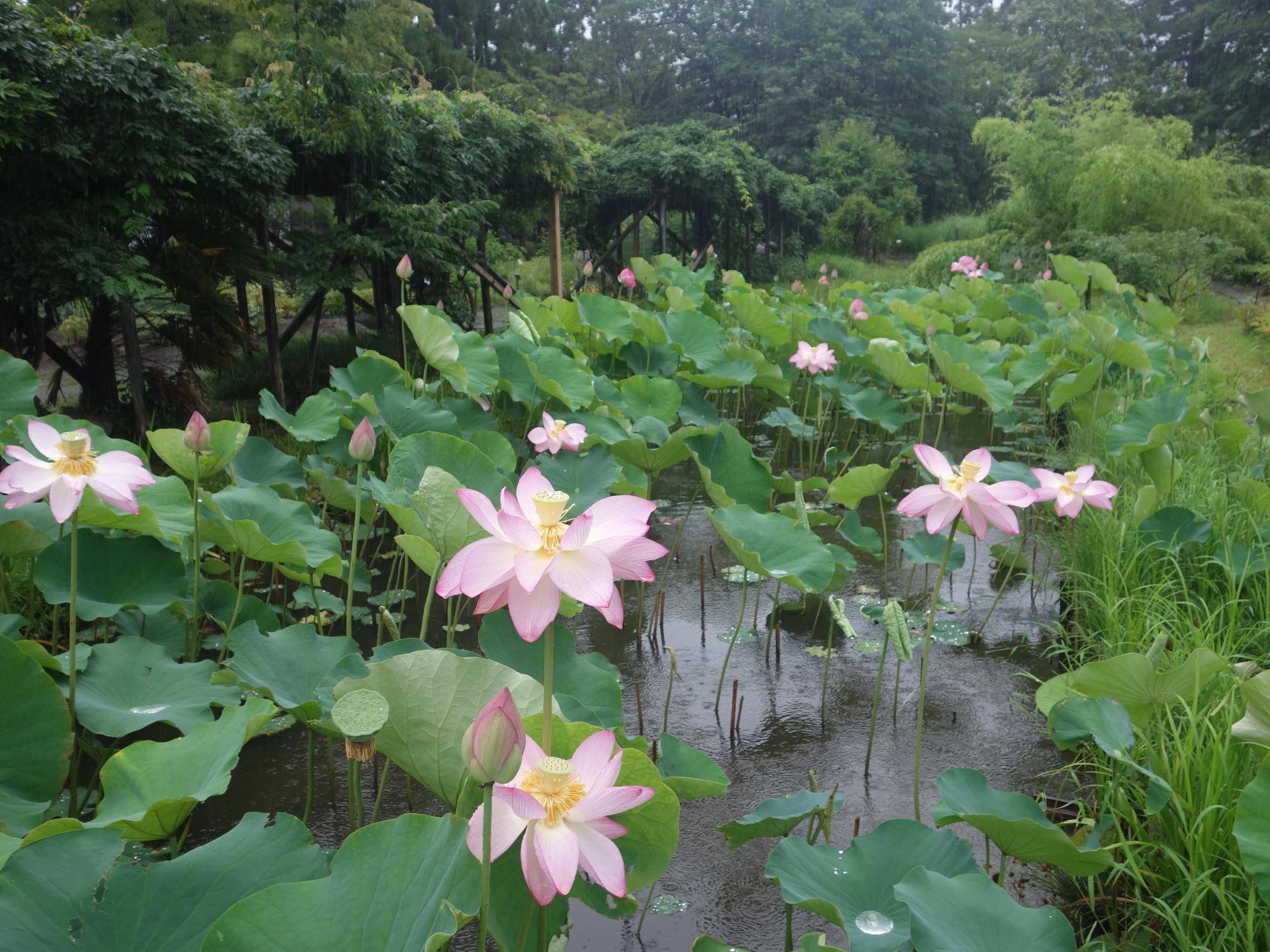 重陽閣の前から、通路を挟んで、ずっと蓮の池になっています。去年も雨でした。この季節は仕方ないのかもしれません。