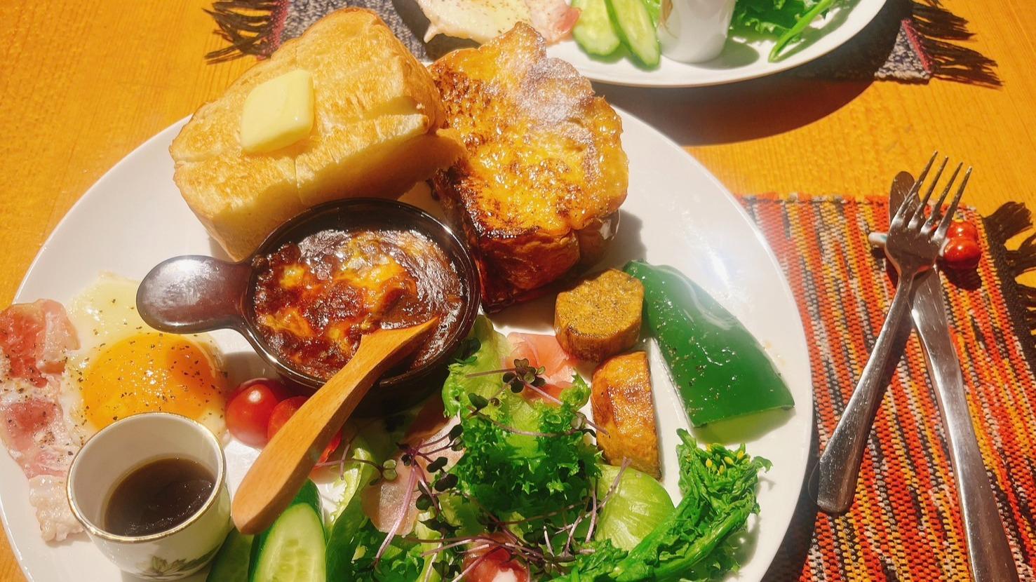 モーニング Bセットの内容・フレンチトースト・ベーコンエッグ・温野菜・チーズ焼きカレー・サラダ・金子牧場さんのヨーグルト・季節のフルーツ・コーヒーとなっています。