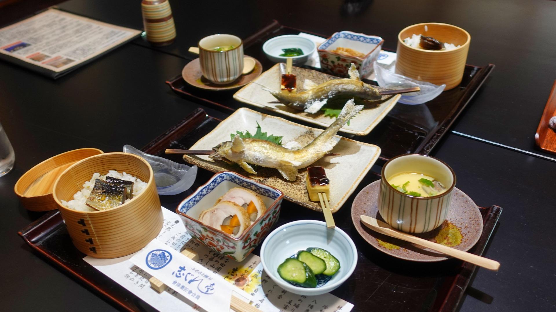 丁寧な事に鮎の踊り焼きの食べ方も案内されていました。鮎酢は一般的な蓼酢(たでず)ではなく甘酢。蓼酢は好き嫌いが分かれるからとの説明。鮎の身がホロホロとはよく使われる表現ですが、実際に身が締まっている事の方が多いと思います。志ぐれ亭では、食べ頃、ジャストタイムの焼き加減で出されました。予約の電話で「お時間に変更があれば料理の都合上、早めにお知らせください」と言われましたが、まさしく、この美味しさを味わうために時間は厳守でした。
