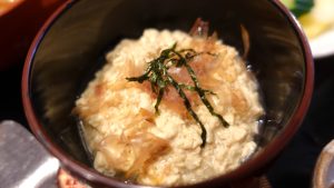 東山の東、猪苗代側にあります。その湊町の伝統料理の一つが「豆腐もち」お正月やお盆、ハレの日などのご馳走料理。つぶした木綿豆腐に醤油、出汁、油を混ぜ火にかけたものを餅に絡めてあります。そこに鰹節、刻み海苔がふられてます。