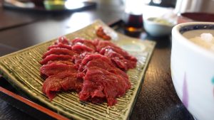 気になるお値段 1,500円です。そもそも、馬刺しは高く、それが最近の物価高騰で更に高級品となっています。ちなみに、会津で「馬刺し」と言えば赤身。霜降りもメニューとして出す店もありますが(たぶん)、食べてみた話を聞く限り「赤身好き」が多いようです。そもそも、会津の馬刺しは軽種馬で馬の種類(肉質)からして異なります。普段、サシの入った(霜降り)馬刺しを食べ慣れている方には会津の馬刺しは独特と思われるかもしれません。