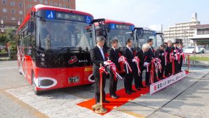 2023年10月27日、会津若松市の観光地を巡るまちなか周遊バス「あかべぇ」に電気バス2台が登場しました。(写真では3台のバスが並んでますが、あかべぇは手前の2台です。奥のは新型車両の1台と思う)「まちなか周遊バス」は一度乗っていて、その時はボンネットバスでした。また乗りたいと思っていたのですが、電気バスが導入されると聞き、良い機会と出発セレモニーの日に乗ってきました。