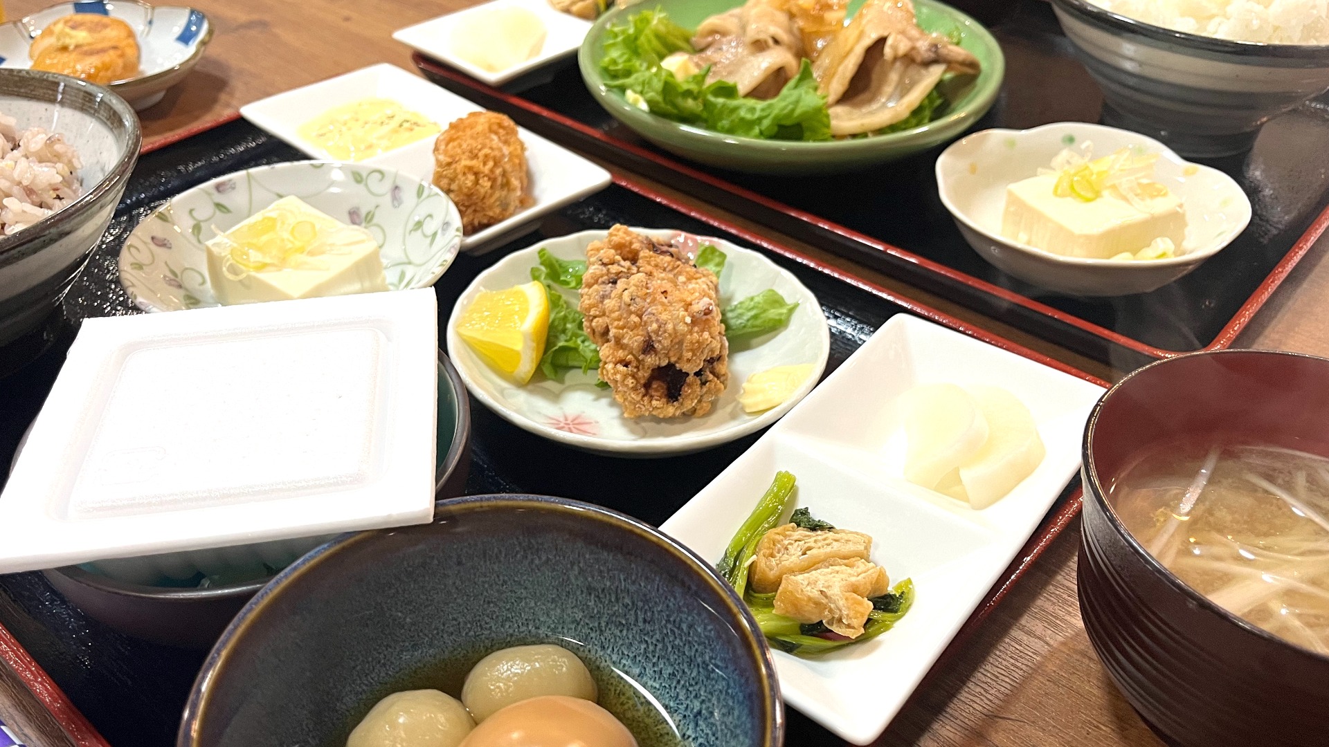 連れの注文です。左上は「牡蠣フライ」。最初に「牡蠣フライ大丈夫ですか?」と尋ねられています。納豆がついてお得な感じ(連れが喜んでます)。納豆はパックで提供されました、写真の前にパックから出しています。ご飯は、白米か雑穀米が選べて、雑穀米をお願いしました。