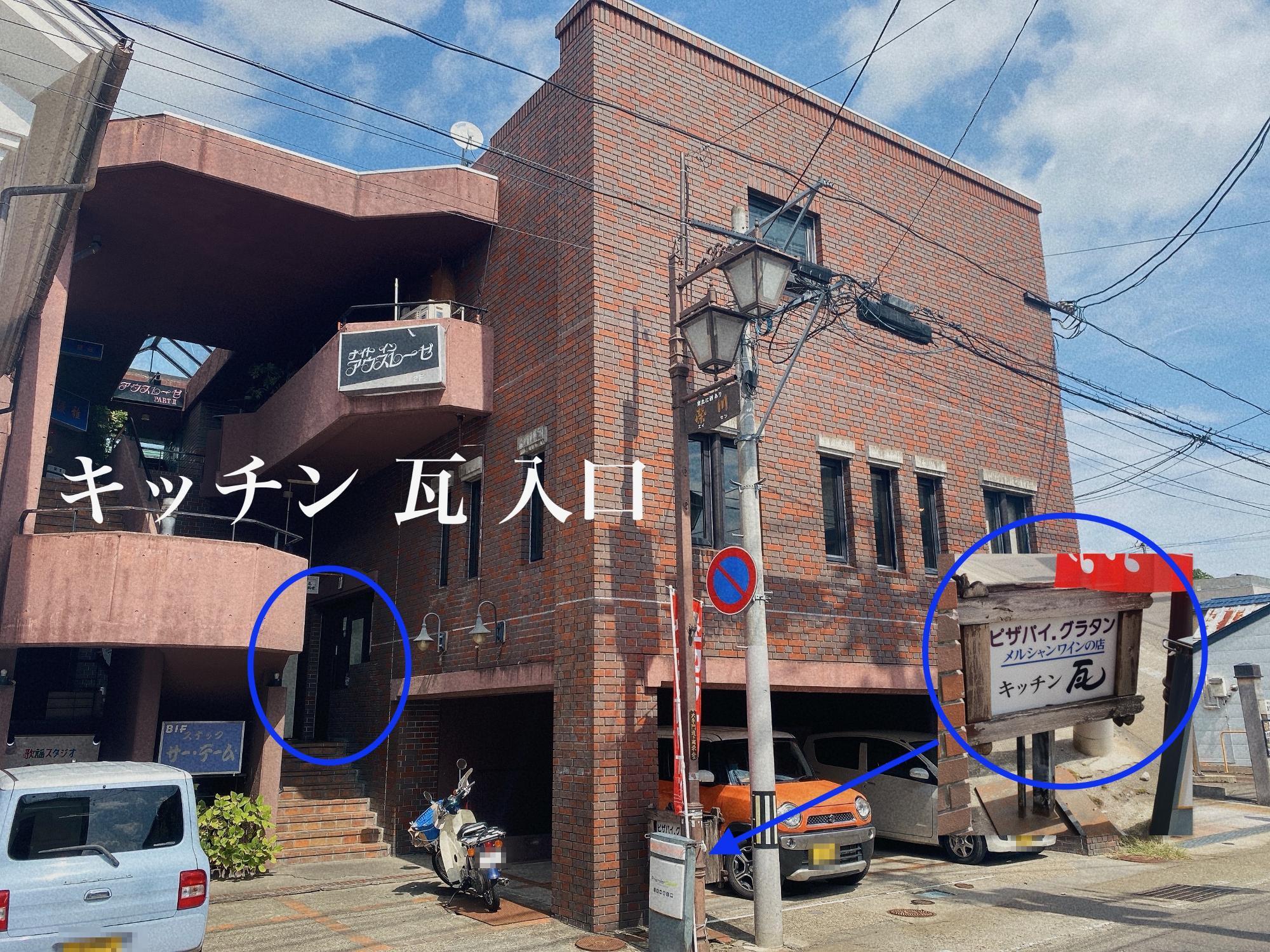 青丸で囲んだところが店。「キッチン 瓦」→ 矢印が店の入口。写真、手前から奥へ一方通行なので、店まで進んで駐車場へ戻るのは大変です。北出丸大通りの交差点から先、左に寄って減速してゆっくり進めば安全です。