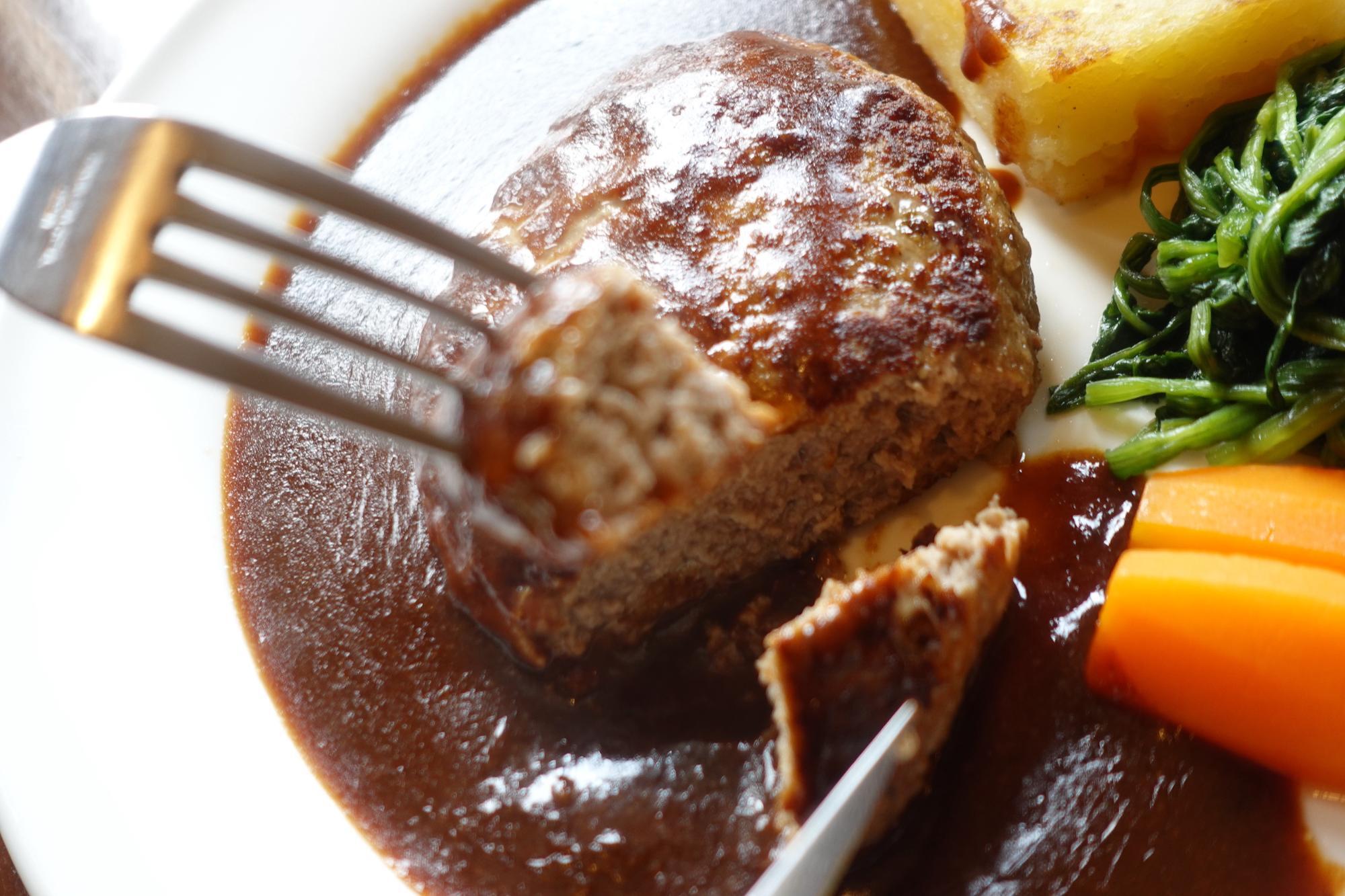 ハンバーグは厚く、食べ応えしっかり。ソースが滋味深く濃厚でいて、ハンバーグの味も引き立てます。このままでも美味しく、ライスとも美味しく食べれます。