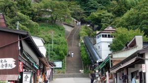 石段の右側にスロープ・コンベア(動く歩道、屋根付き)があって、250円でかなり上まで石段を使わずに上がれます。