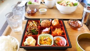 おかずが9種類。甘いの、塩っぱいの、辛いの、酸っぱいのと各種揃って、箸が迷う。ご飯に、汁に、デザートがつきます(飲み物は別)。